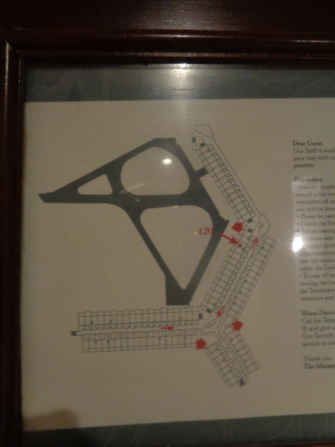 -I was assigned room 420 (see floor layout). Room was a bit dated in terms of furnishings, but I don't care about such things. Bed was comfortable, room temperature was adjustable, and there was a balcony with two chairs and a small table; lots of water. I also had a handwritten welcome card (came in handy later) and a plate of fresh fruit. My only complaint was that the towels were of midrange hotel quality and that instant coffee provided.