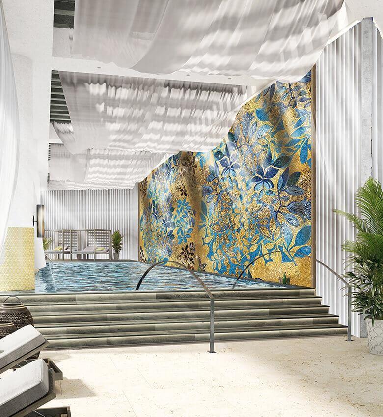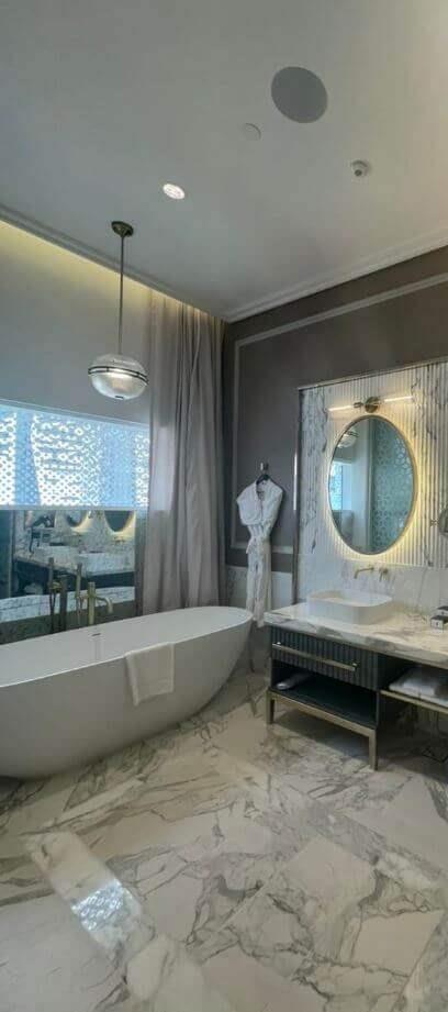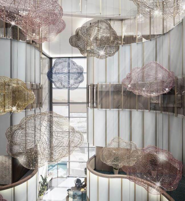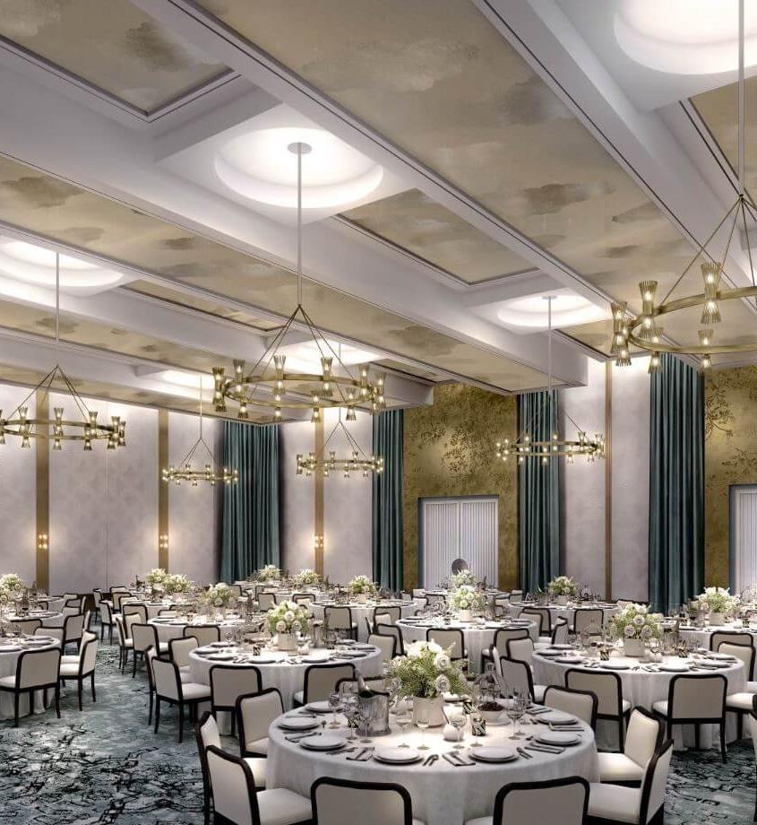 Renderings of the exterior, lobby, atrium, standard room + bathroom, presidential suite, gym, pool and ballroom: