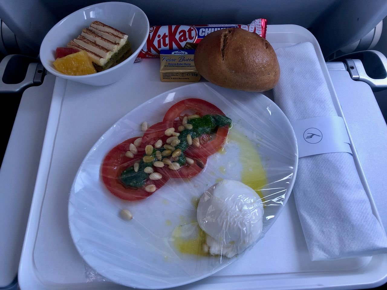 This was the meal in Business on LH 1555 HER-FRA, a three-hour flight that departs at lunch time (12:45). To say that three slices of tomato and a bit of mozzarella were disappointing is putting it mildly. Maybe the extra-long "Chunky" Kit-kat was supposed to make up for it?