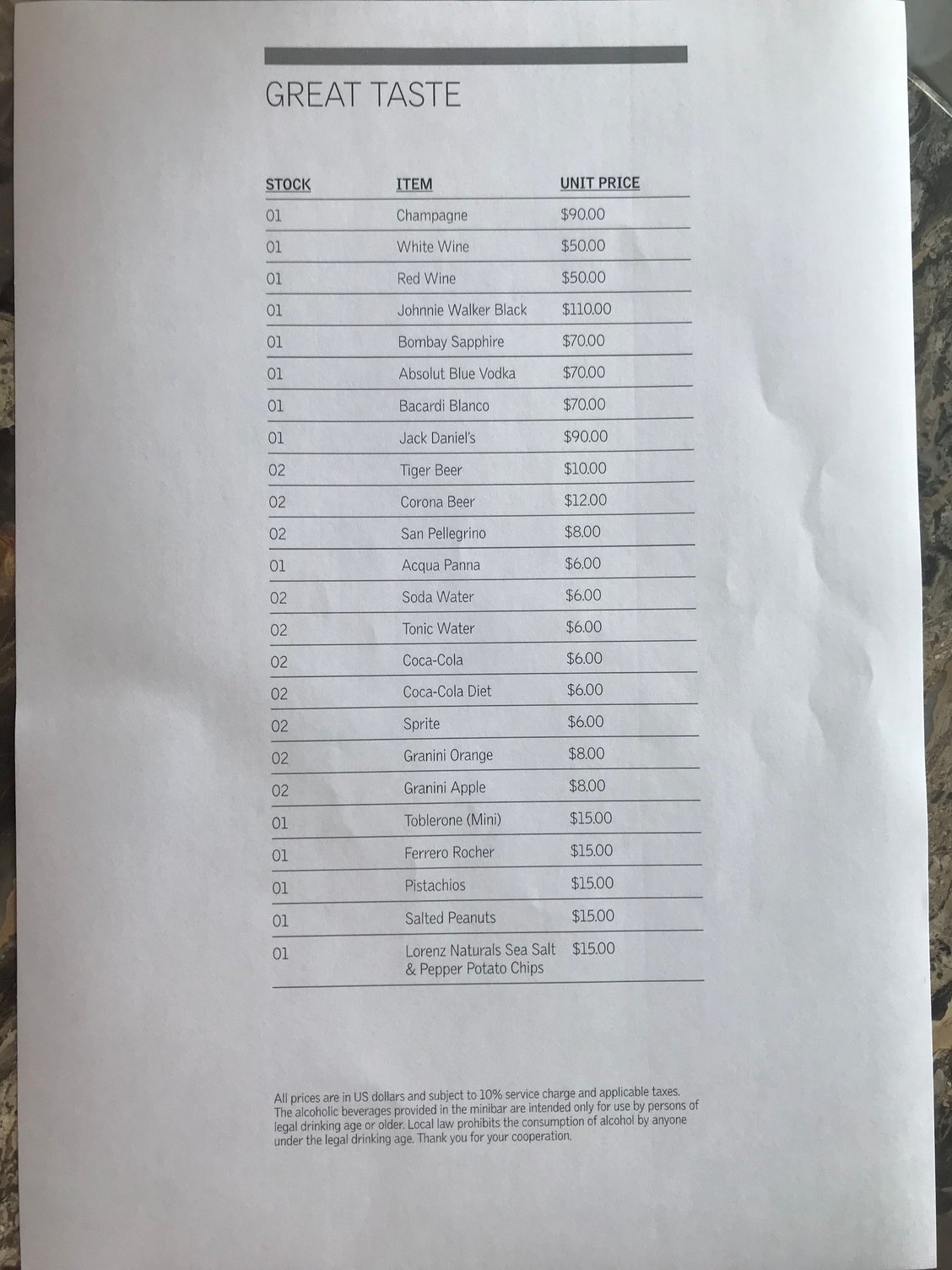 I'd be curious if somebody could share the minibar/room service menus. I understand that the Maldives has us as a captive audience in terms of alcohol, but I'm contemplating bringing cans of tonic and such rather than paying $5 a pop.