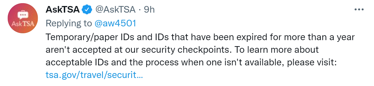 “Temporary and paper IDs aren't accepted at our security checkpoints.”