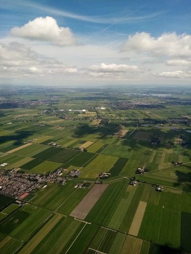 On the approach to RWY 36R (Aalsmeerbaan). Part of Zevenhoven bottom left (guess that makes it Drie-en-een-halfhoven or so), Mijdrecht in the background, with the Vinkeveense Plassen and the Baambrugse Zuwe.