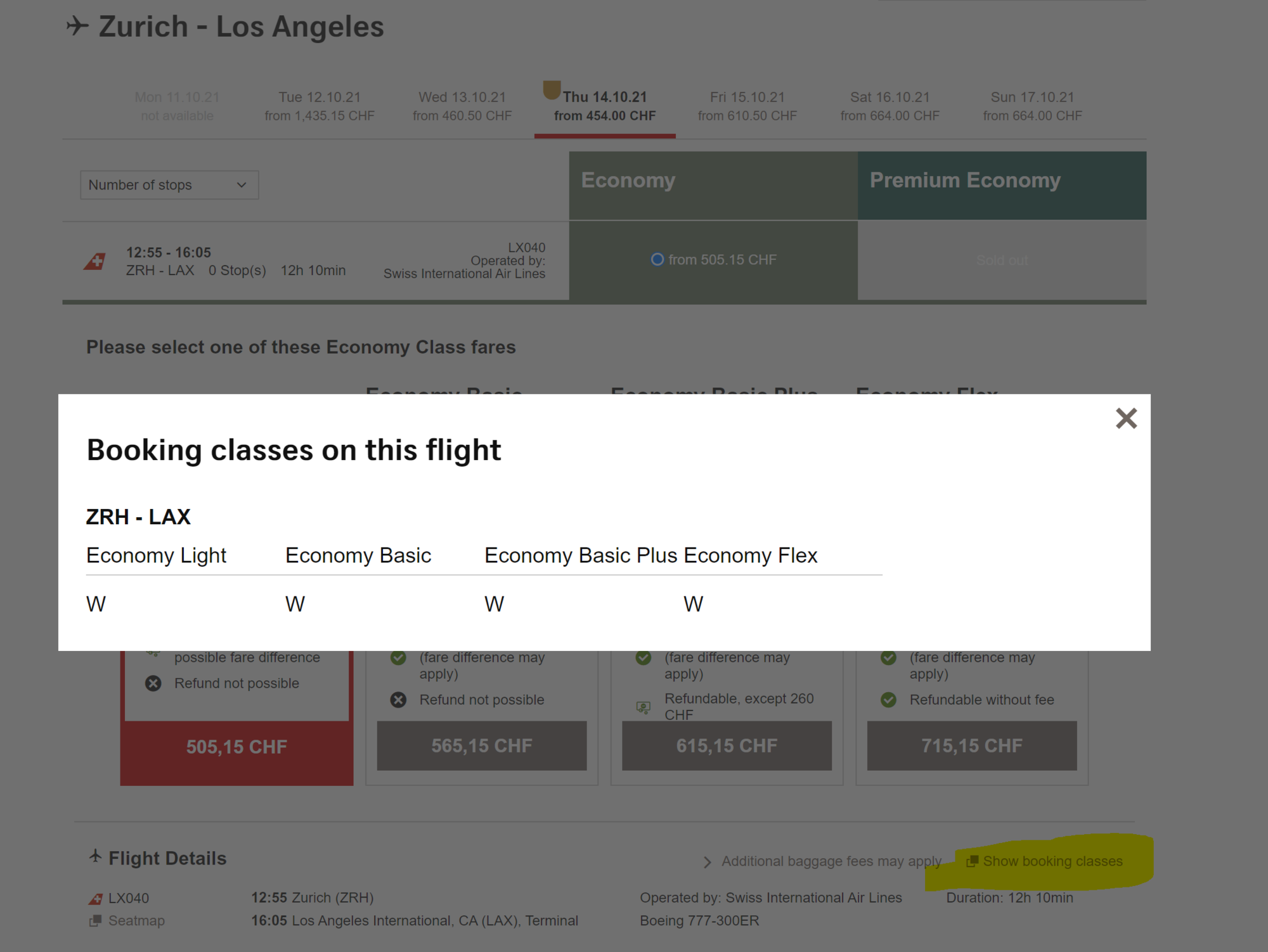 the booking class is visible on lx.com, but you have to select a flight first and then click on "show booking classes"