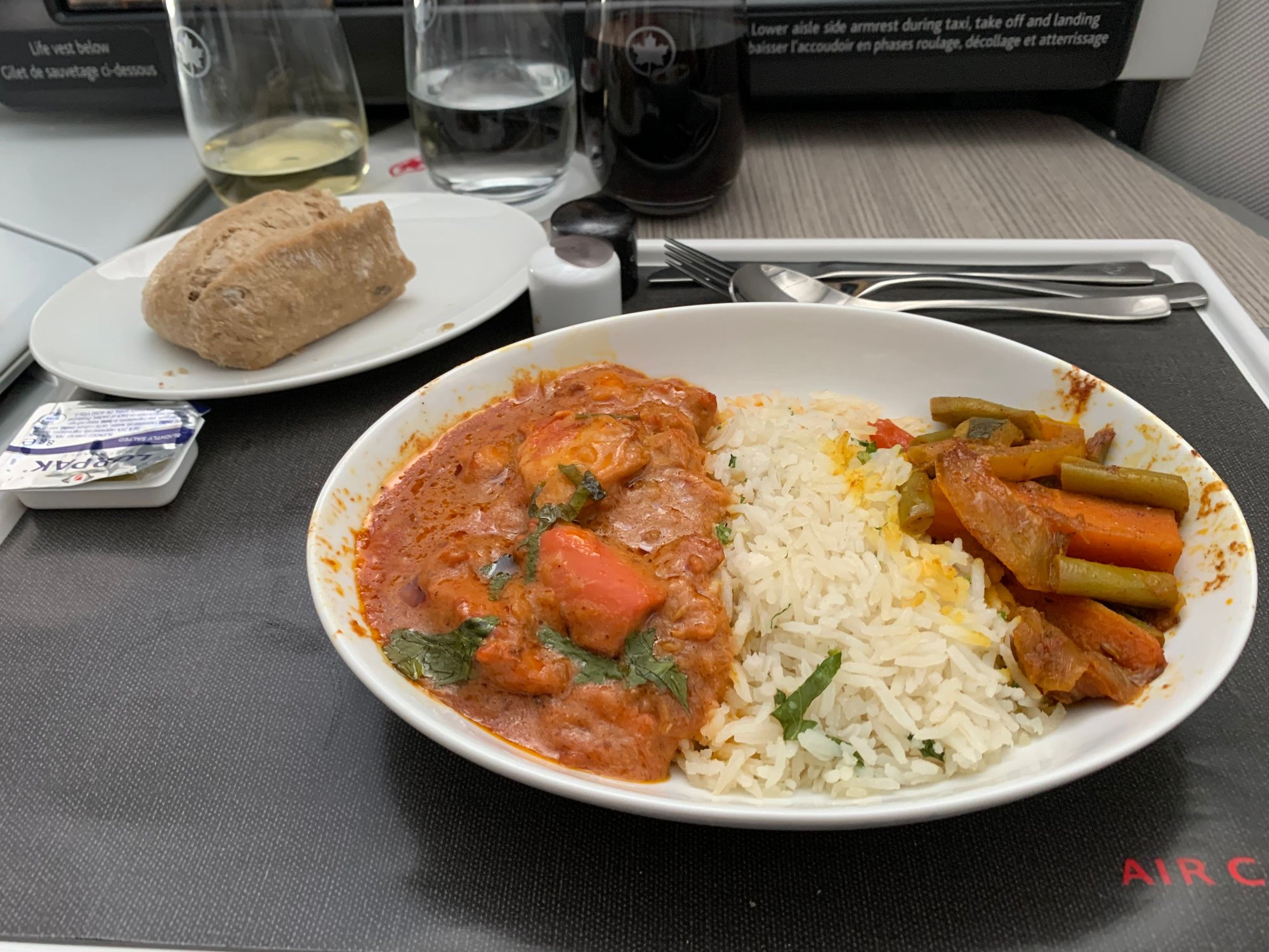 A few pics from a recent LHR-YYZ. The seafood appetizer was good overall. The main course choices were pretty disappointing with butter chicken or pasta. The butter chicken was mediocre at best and a bit oily. It would be OK as a Premium Economy meal, but not really up to what most would expect on overseas Biz class.