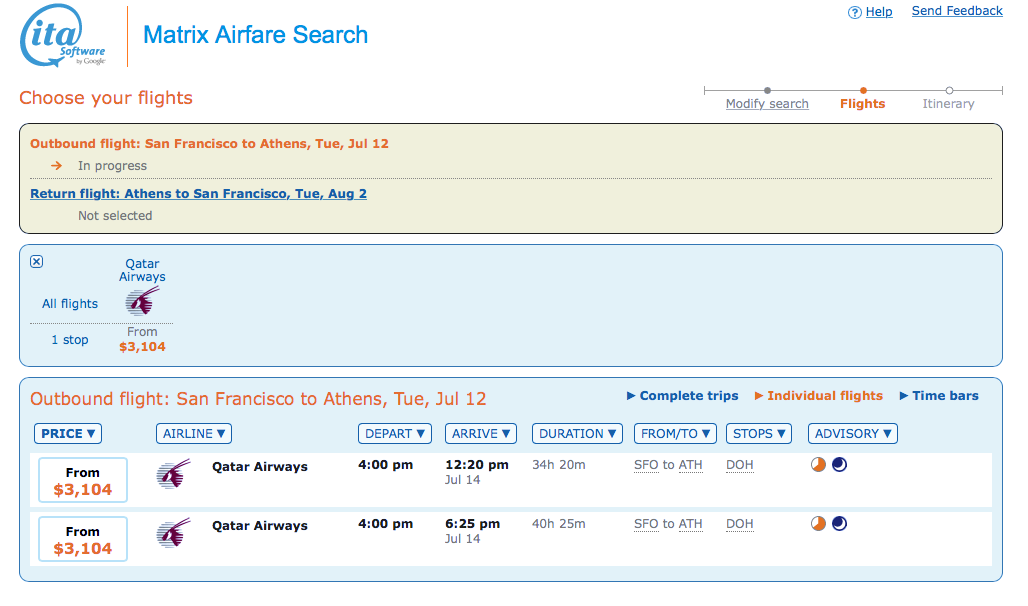QR, SFO-ATH, for $2,370! (and somewhat higher from other cities).Availability is somewhat more limited after May, but there are quite a few summer dates. Unfortunately it is the stripped down business light