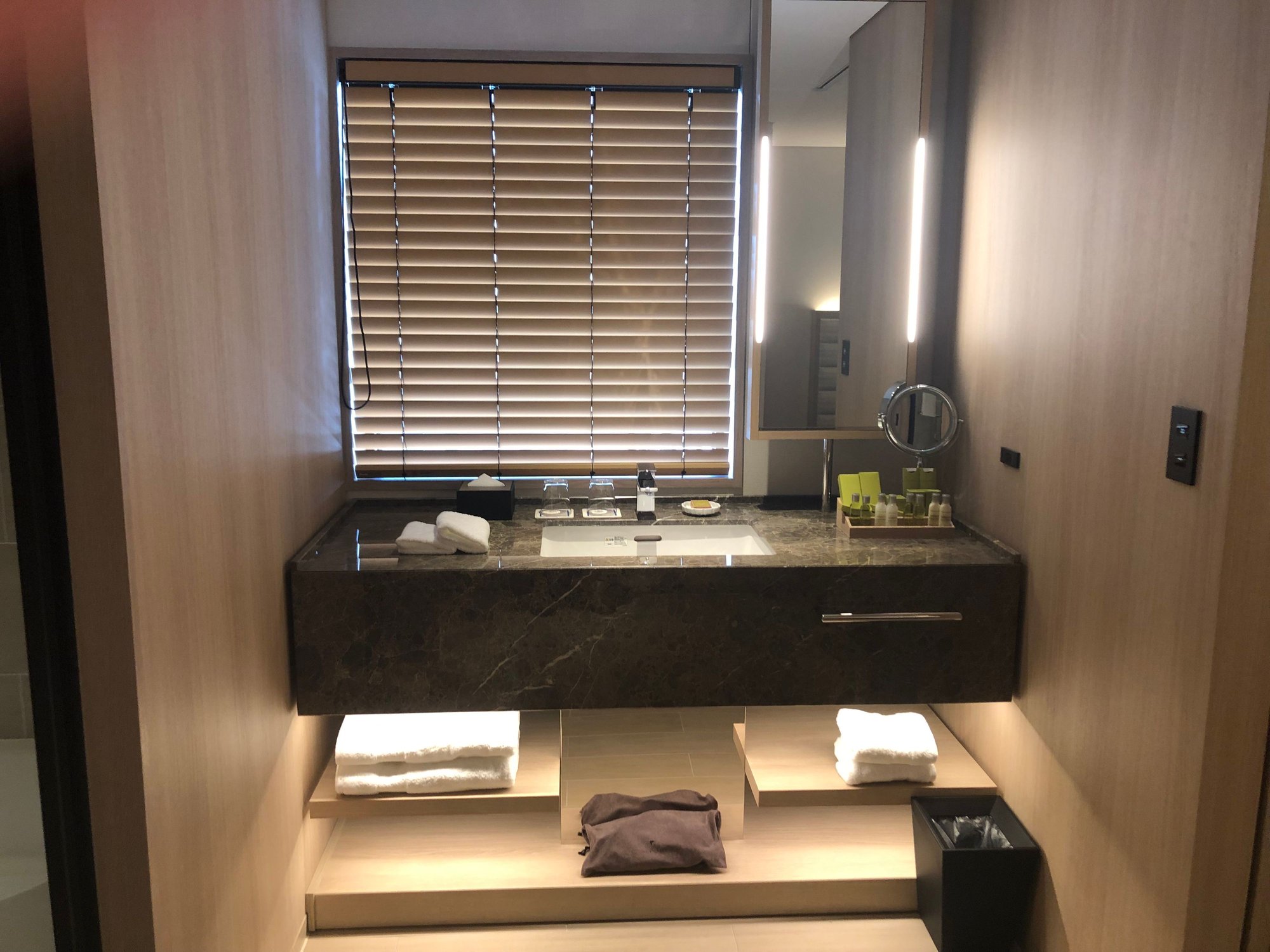 The rooms are all located on floors 6 to 11. I reserved a Premium room of 38 sqm (one grade above a standard room of 31 sqm) but was not upgraded since this was the hotel’s opening week and it was extremely busy, but I did get a room with a better view. The room was nicely appointed with a 55-inch 4K TV, an open washroom with sliding doors that could enclose the space for privacy, a bath and shower room, a separate bathroom (toilet), a self-described mini-bar comprising an empty fridge and a drawer with glasses, cups, tea, and coffee, and a plastic hot water heating pitcher. No drinks or snack foods were available in the room for purchase. There were two chairs and a table as well as a small bar counter with chair and pleasant window view. Since the hotel was recently built, everything was in clean and pristine condition.