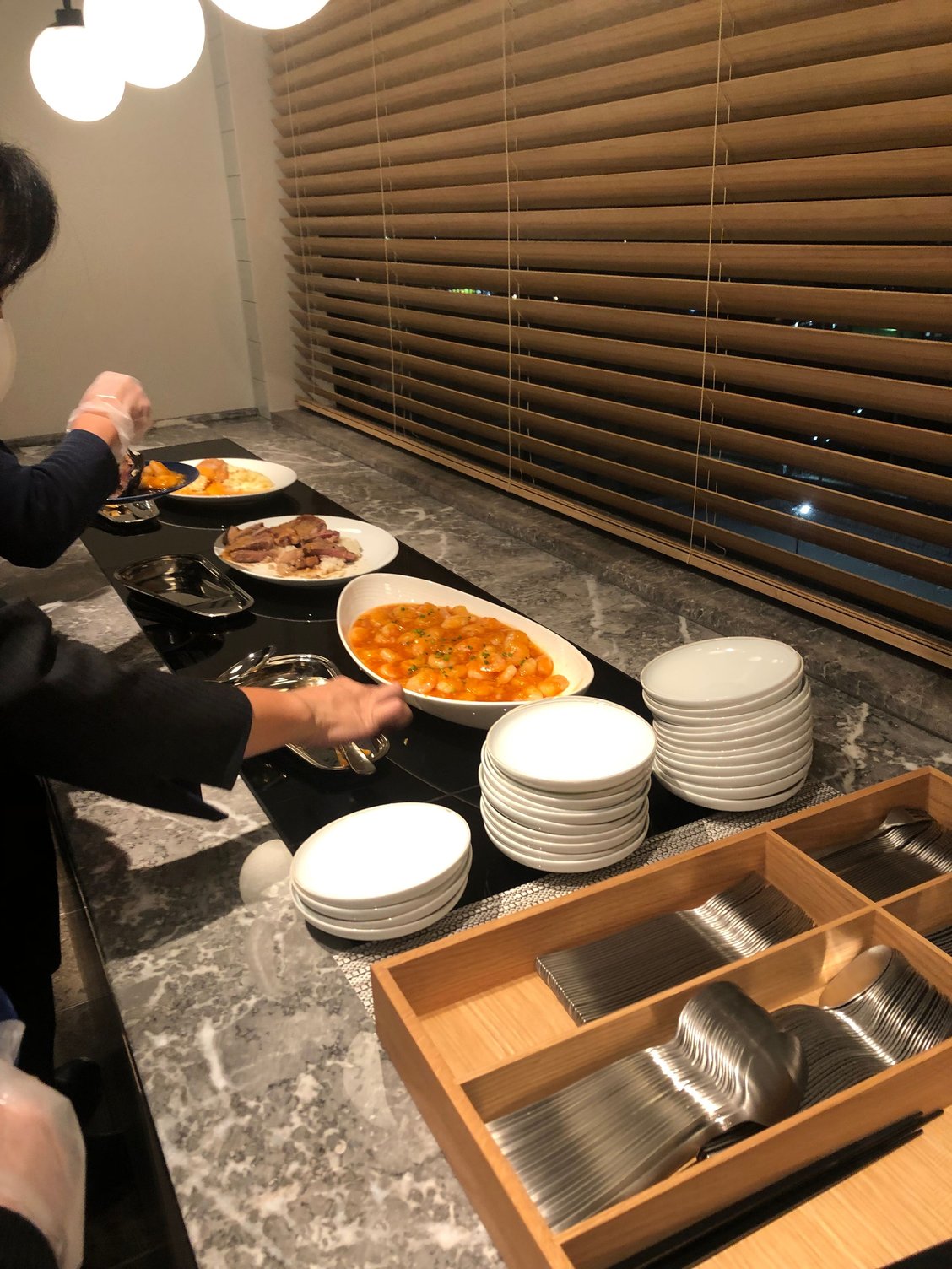 The lounge is on the 11th floor, the top floor of the hotel. I tried to use my digital key to access this floor but was denied with a recording that this was a restricted floor. Fortunately, others with access were also going there so I could enter the lounge. I explained my predicament to one of the staff and she provided me with a card key that gave me access to all floors. However, the lounge was crowded, and I couldn’t enter, so I asked them to call my mobile phone when space was available and went to the lobby bar for a drink. About half an hour later I received a call and was told I could enter the lounge. Though not terribly large, the lounge is a bright space with many windows and provides a nice view of Nagasaki. The food and beverage space is a little cramped but the food offering was significantly better than that at Conrad Tokyo’s executive lounge. Several cold white and rose wines along with sake were available in a large ice bucket while non-alcoholic cold beverages were stored in a small fridge. I drank two varieties of Chardonnay that were very good. Three cooked dishes comprising beef and rice, chicken and rice, and chili shrimp along with some cold cuts were on the food counter. There was also a selection of nuts. While good, you probably wouldn’t want to make a meal of it, especially if you’re also drinking alcohol, as there was simply not enough. The lounge is open most of the day, but cocktail time is from 5:00 to 7:00 pm.