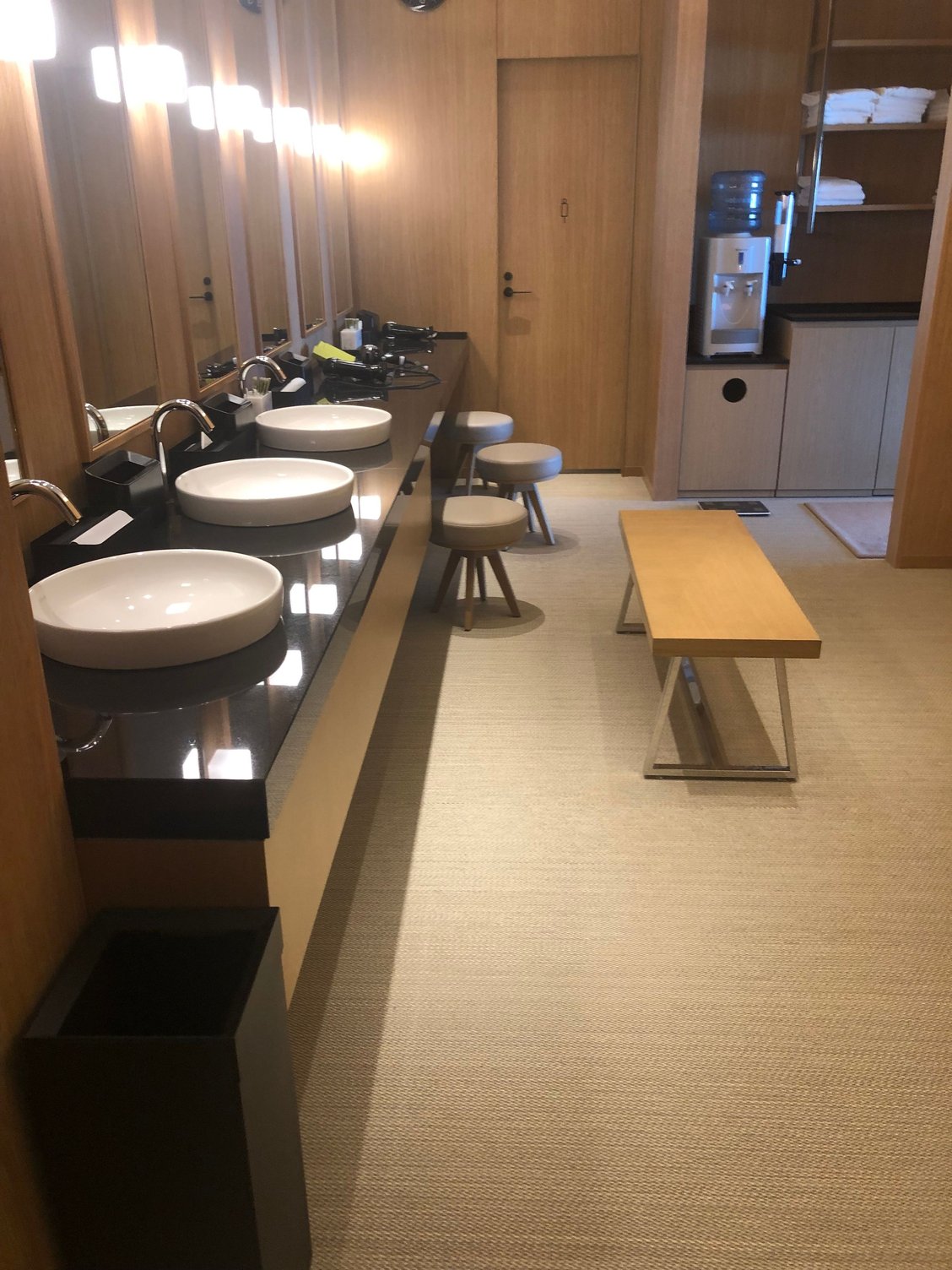 The bar is located directly opposite the check-in counters. Here you can sit at the bar or at tables and also partake of afternoon tea. While waiting for space to open in the executive lounge, I came here and drank a Yebisu beer on tap. The bar has an extensive drink menu with numerous cocktails listed. After dinner, I came here again and ordered a Blue Hawaii, which turned out to be green and not blue. I expect that someone reading this will point out that blue in Japanese can also mean green but that’s only when the Japanese word is used. In this case, “blue” when spelled out in English in the name of the drink cannot mean green. Anyway, it was my first time to drink a Blue Hawaii (though I know from photos that it is indeed blue), so I had nothing to compare it to, but I probably won’t order it again. The bartender and staff were friendly and attentive, and the bar is a pleasant space for pre- or after-dinner drinks.