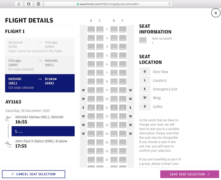 When trying to select seats for the AY flights I get that, for the ORD-HEL flight "they cannot currently be made online" (fair enough), but for the HEL-KRK flight I can actually click the "SELECT SEAT" button, which brings me to a seat map picture where all the seats are greyed out and therefore non-selectable (see below).