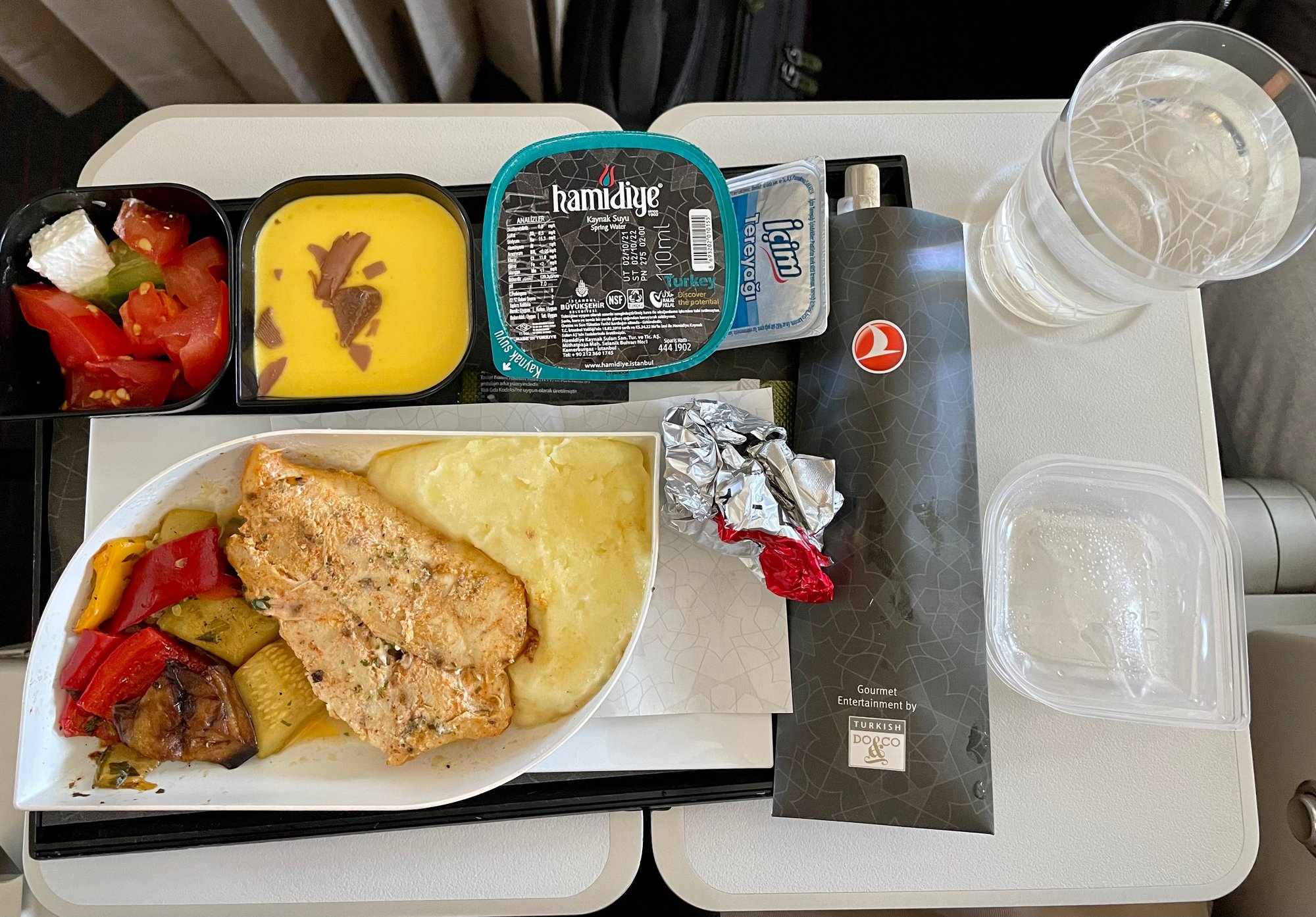 This is from a flight of 2.5 hours. There’s a small salad, a proper dessert (okay, it’s small, but it’s also very tasty, mango mousse) and a simple non-oily chicken meal.
