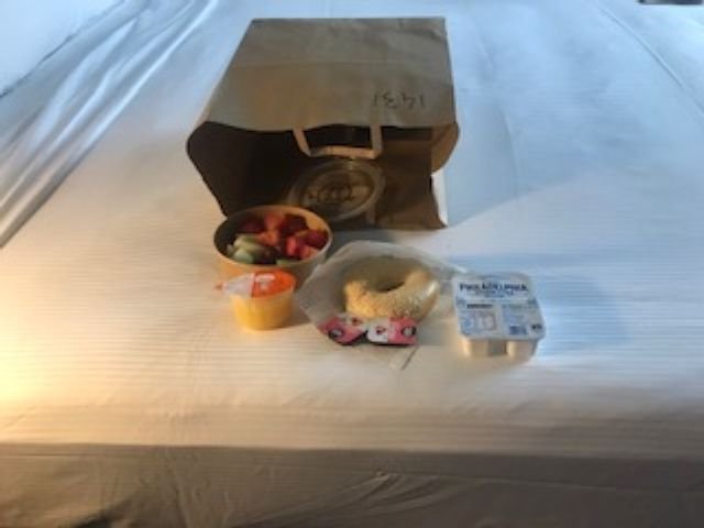 Didn't have a welcome amenity in my room but today I found this outside my door. The bagel was fresh so I don't think they were just getting rid of old quarantine inventory being that just last week they have returned to accepting non-prisoner guests.