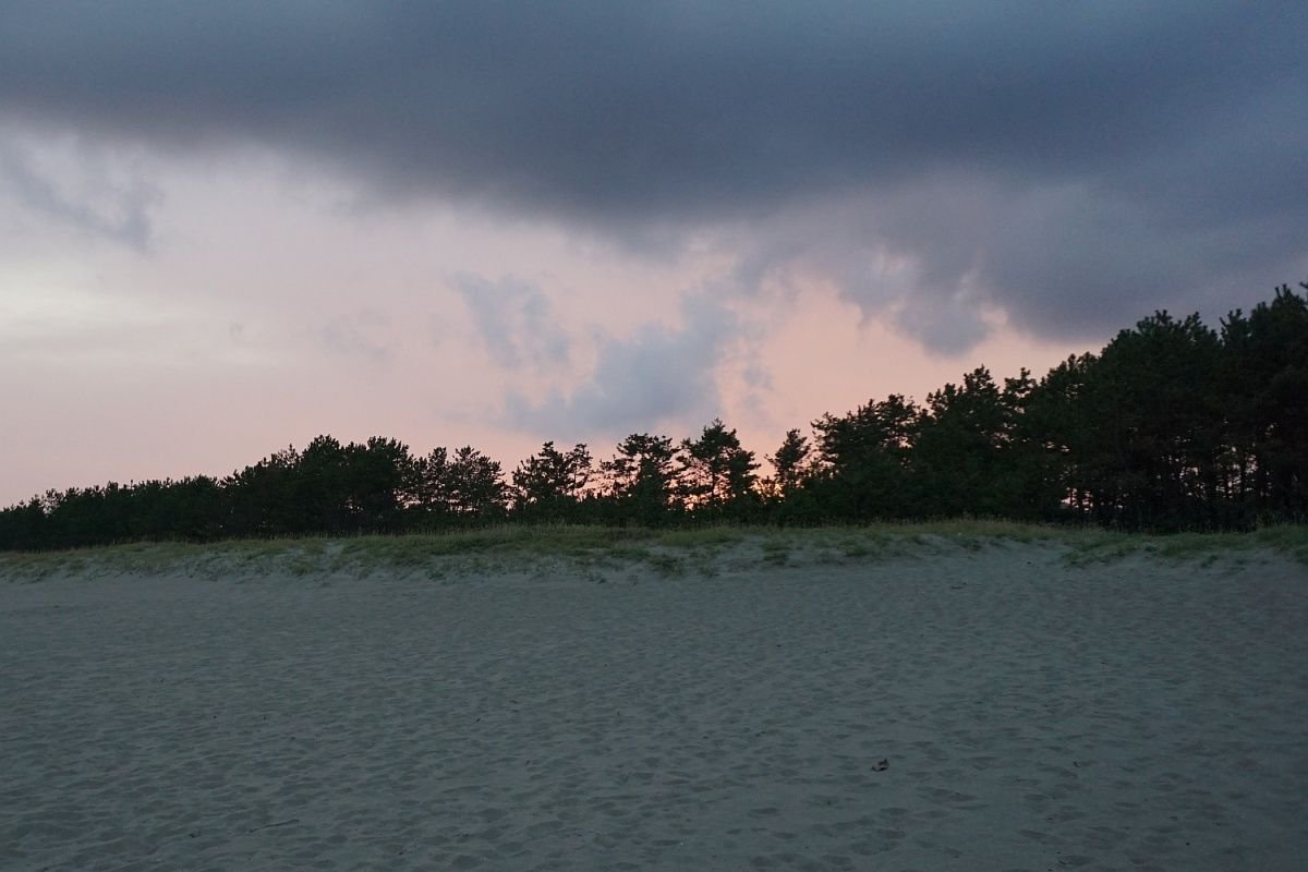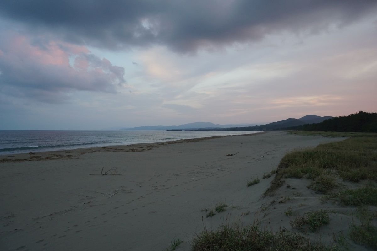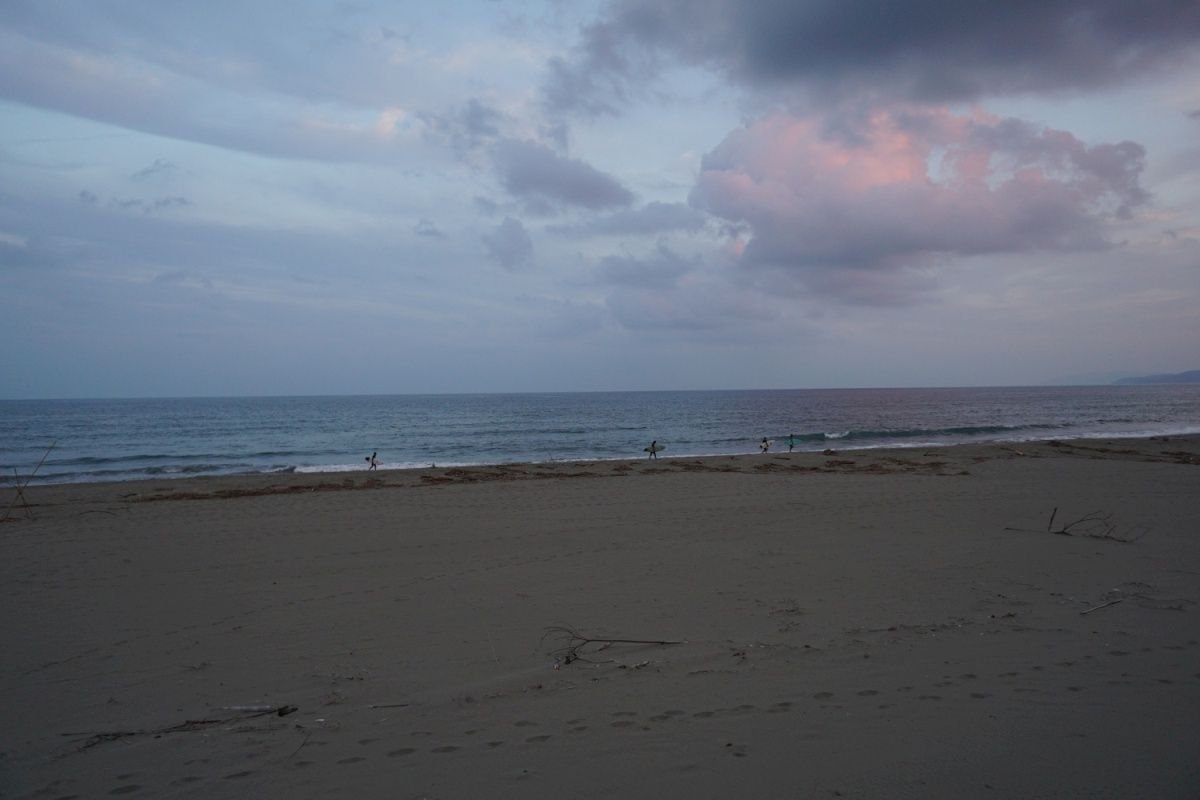 Irino beach. Nobody swimming but several surfers. The beach is on the wrong side to see the sunset, but it's still quite dramatic behind the forest.