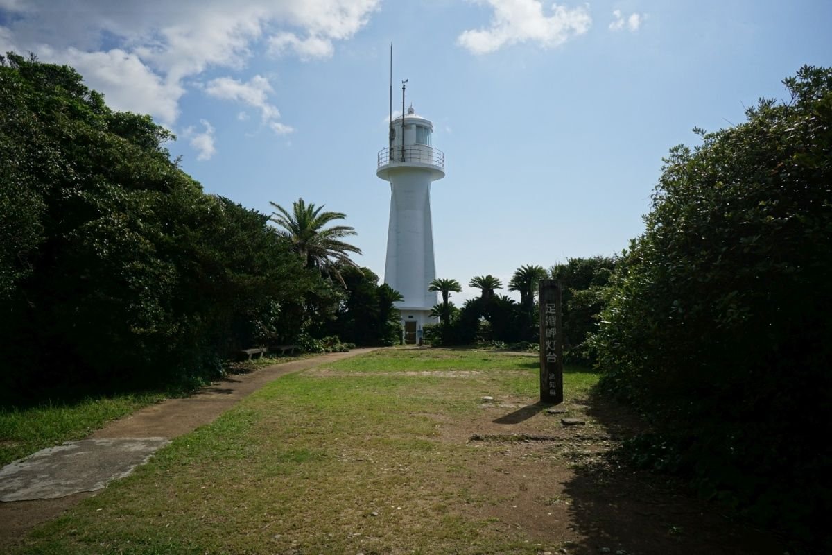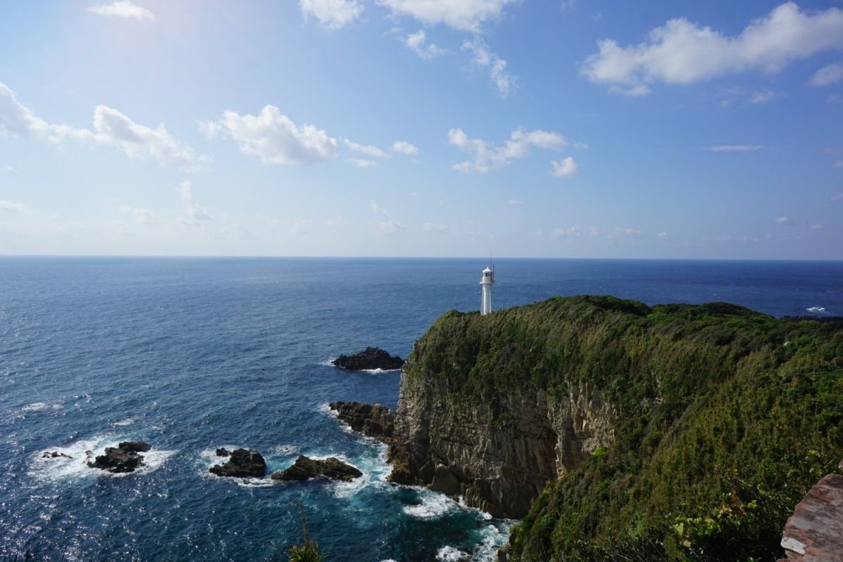 Cape Ashizuri. There was a very enthusiastic tour guide who showed us around the area, pointing out many of the less-obvious features of the landscape and area. You can see the ocean has areas of different colors; it's not the lighting, it actually is that way due to the Kuroshio (Pacific) current mixing with water in the Tosa bay and Seto Inland sea where they meet right here. The lighthouse itself was intentionally built to look futuristic like a rocket ship, and the empty space right in front of it used to be a telegraph and later a radio station.