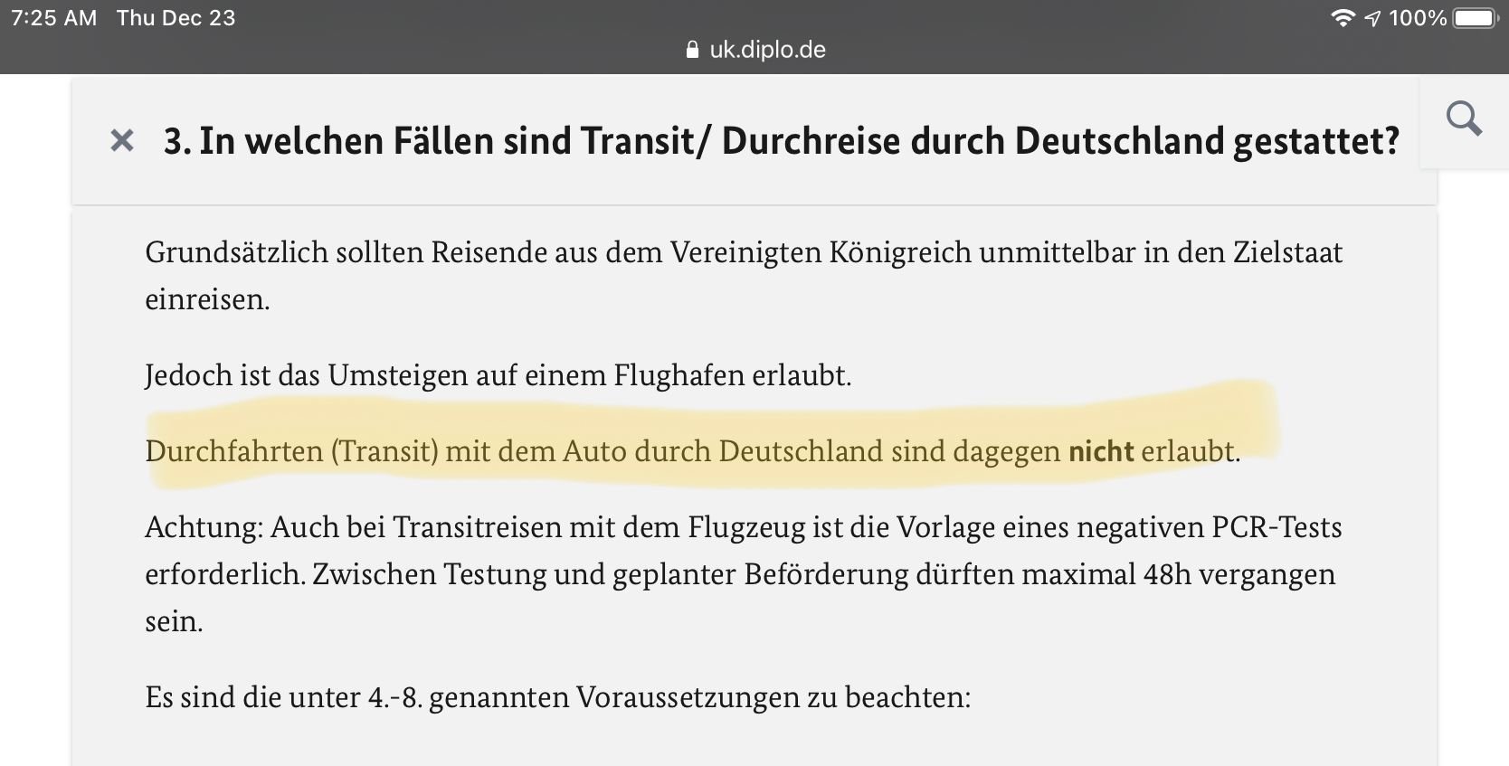 UK a virus variant area it was mentioned just a few days ago that the website of the Germany embassy in the UK was changed and now explicitly disallows transit by car,