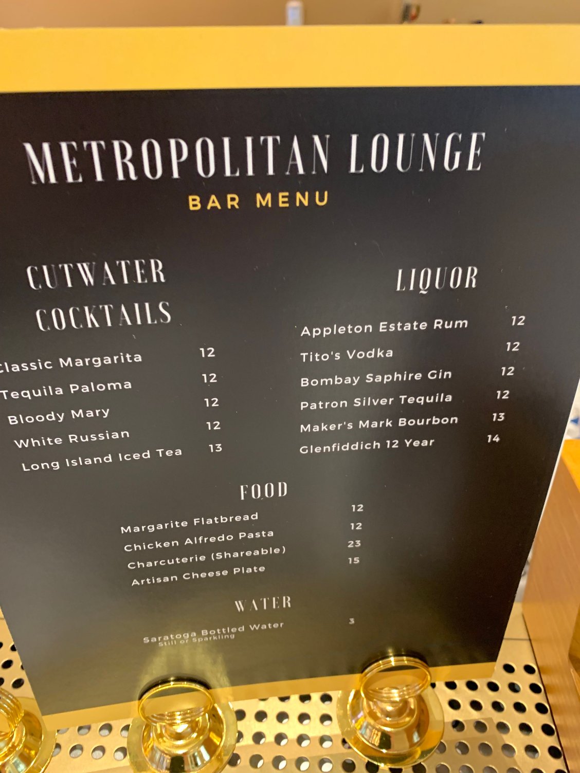 Metropolitan Lounge spirits and food menu