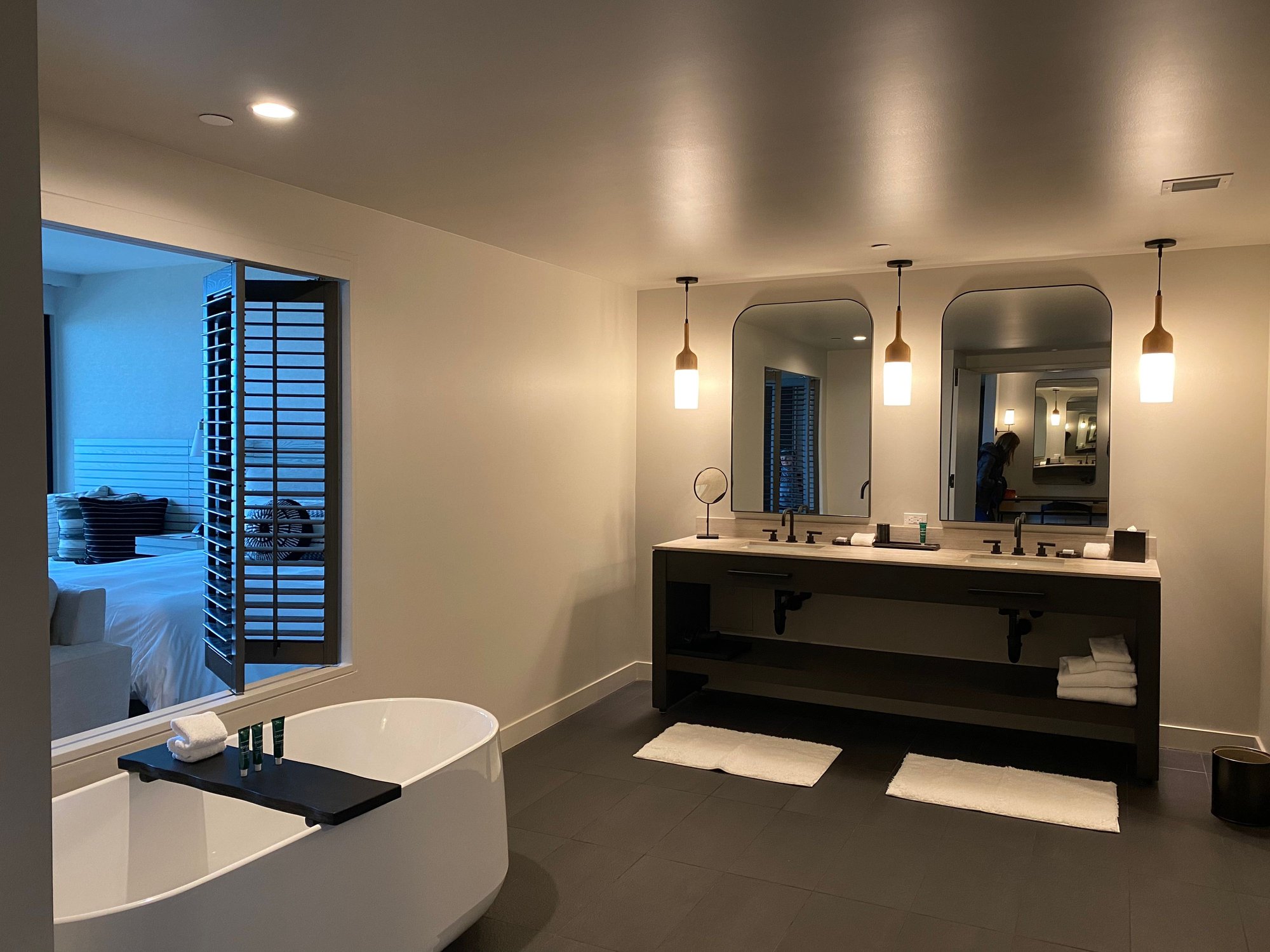 I thought the room was beautiful, with a great bathroom. My son was delighted by the standalone tub and I thought the eucalyptus toiletries were great. I loved the view up the coast to the beach from our balcony. To my surprise, there was a turn down/refresh service while we were out to dinner, which I hadn’t seen anywhere since COVID. The room had two free hard seltzers and Nespresso, along with some sort of luxury sweetened condensed milk creamer that tasted like frosting. There was also a nice tea selection with four choices.