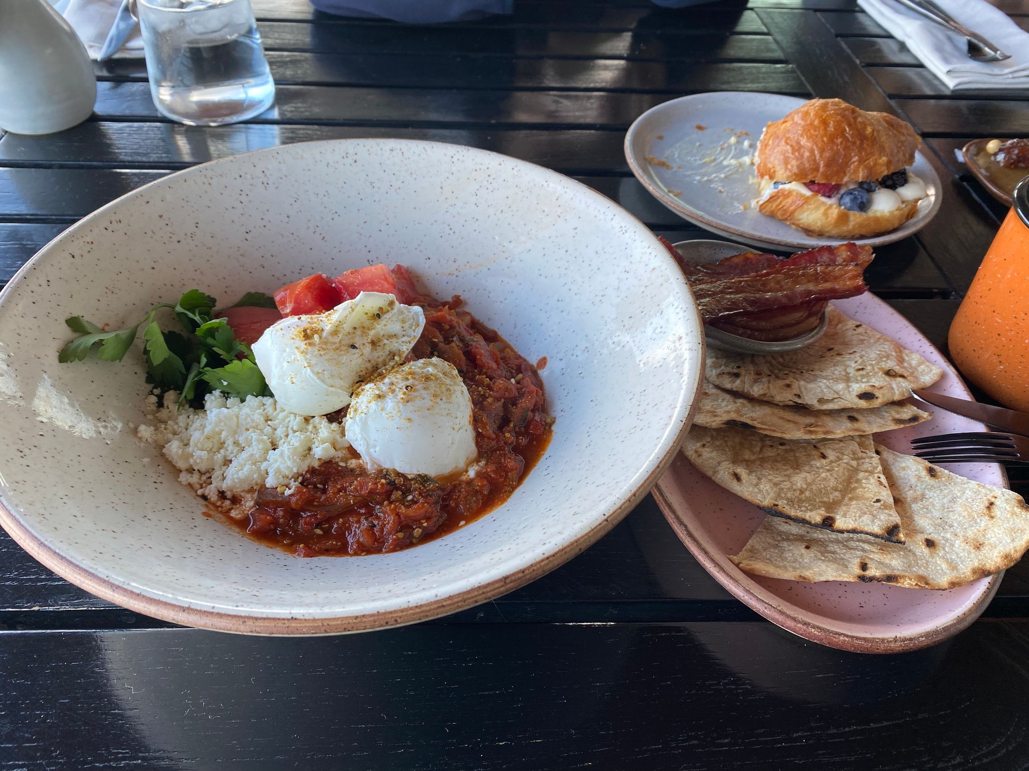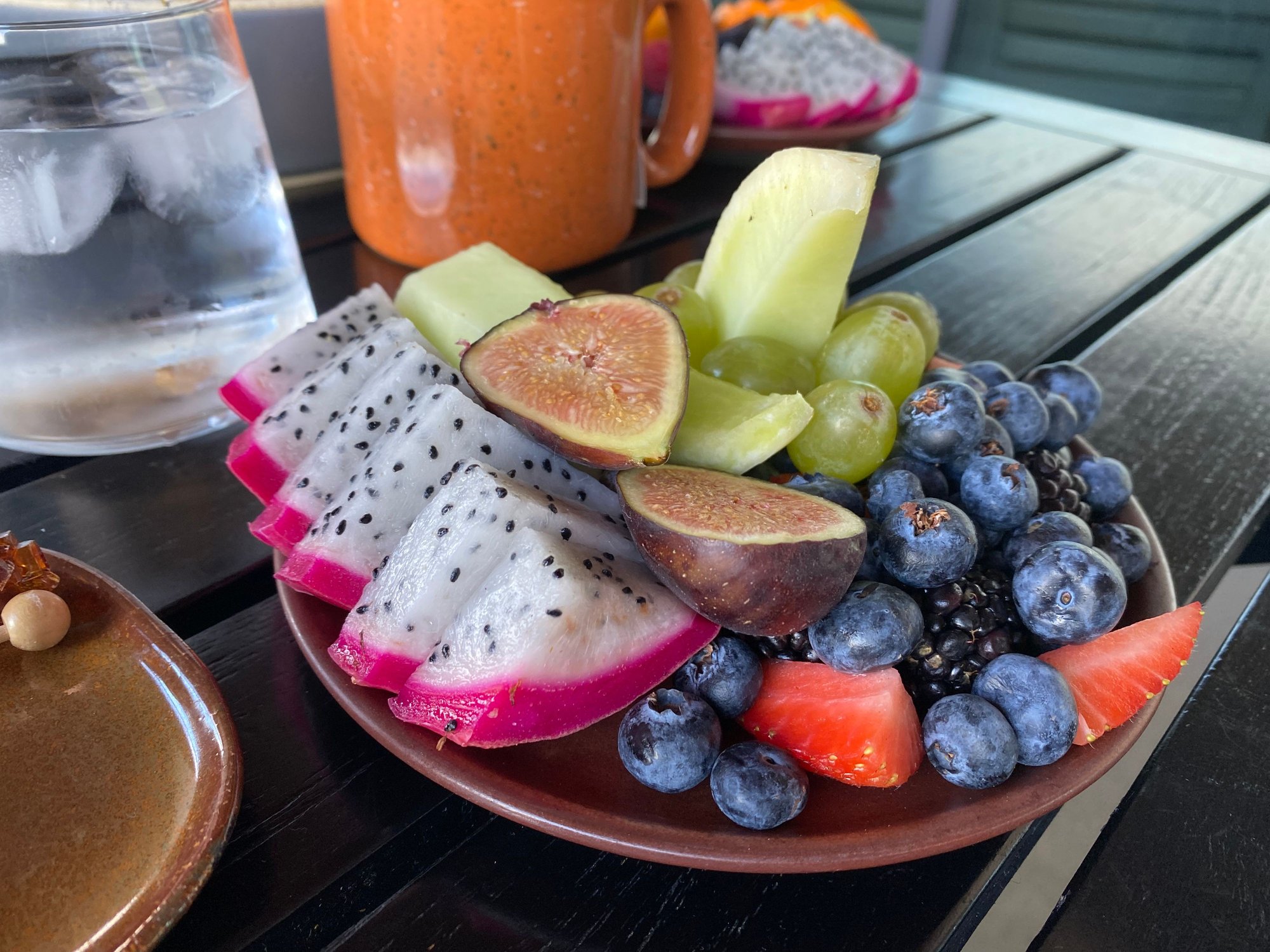 Breakfast was delicious the next morning. We were advised we could each order a drink, side, and entree and we did. The food was great; due to a minor service lapse the waiter also brought a fruit croissant which we ate for dessert and which was delicious. I also thought the fruit plates were very generous with unusual fruit. There were only four outdoor tables, which surprised me, we got the last one.