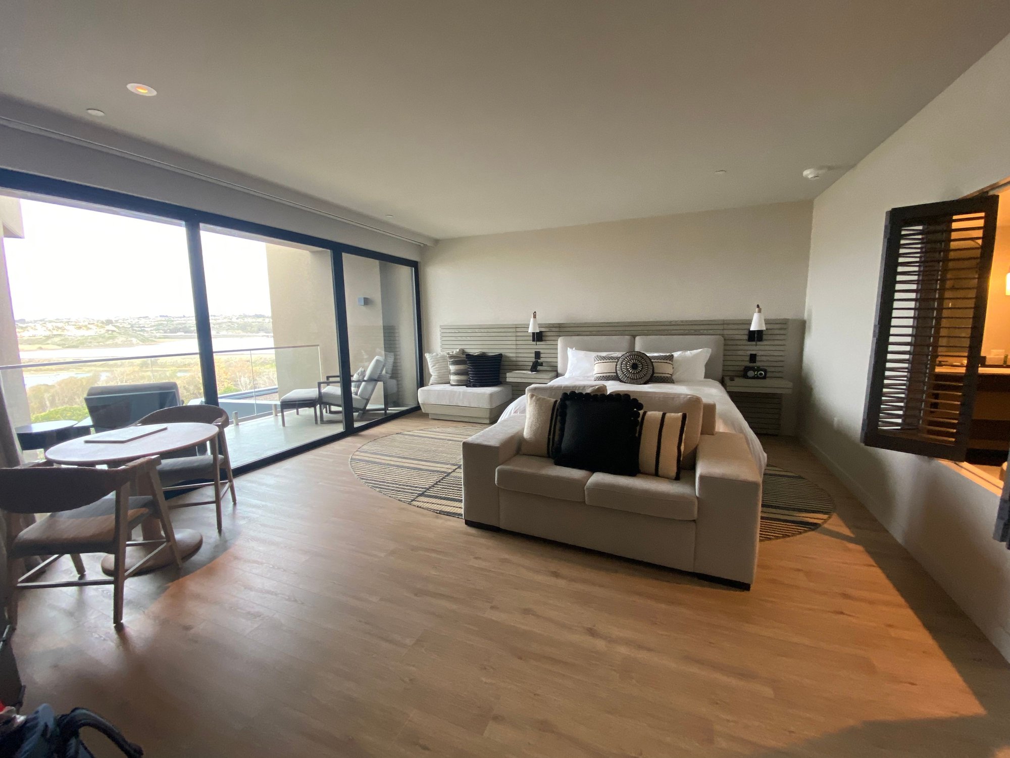 I saw in the Hyatt app the day before arrival that we were upgraded to a coast view studio king (which ended up being on the top floor). At check-in, we were offered the choice between that and a fire pit room on the ground floor. The agent suggested we stick with the coast view studio, so we did. We arrived around 4PM and the couple next to us was having a difficult conversation about how their room wasn’t ready and there was no ETA for when it would be; this conversation went further downhill once they observed us getting a room straightaway and I did appreciate the hotel apparently prioritizing rooms for Globalists.