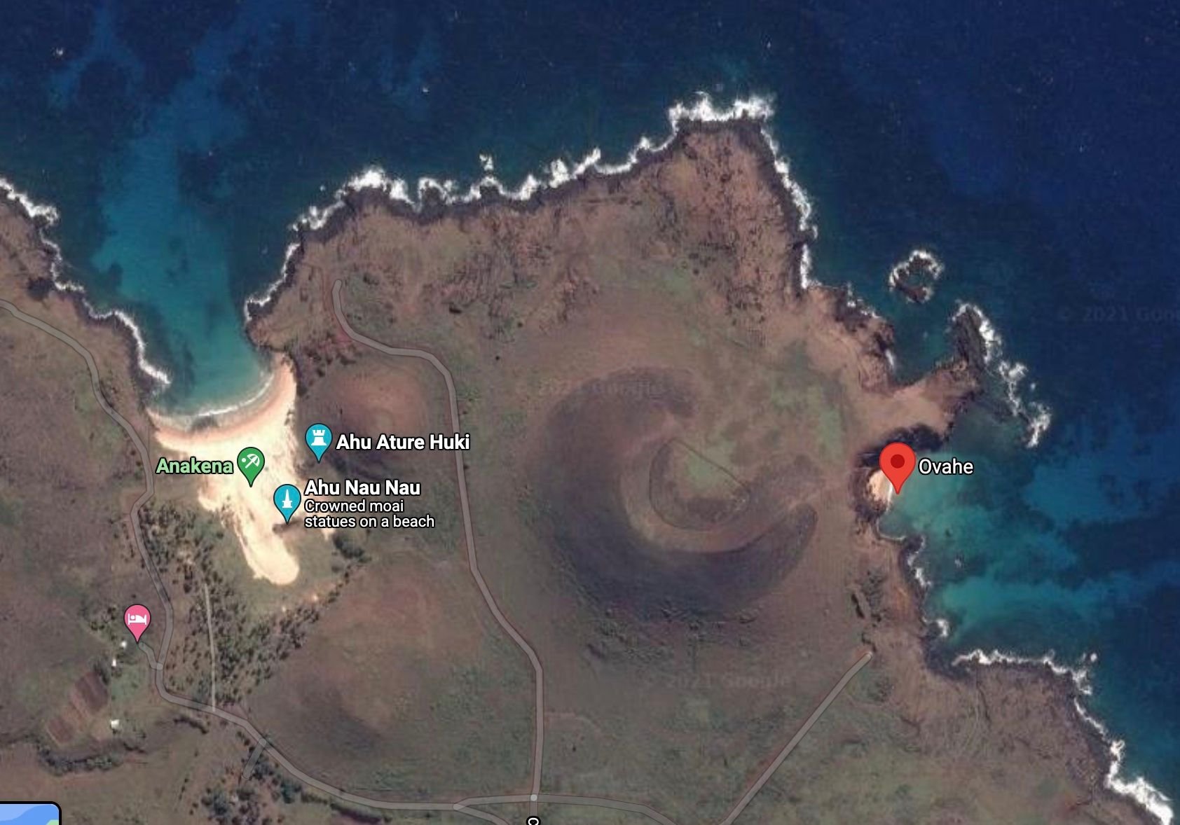Only two "real" beaches are accessible on Easter Island, Ovahe, which is the smallest, wildest one, and facing the La Perouse bay (which has some turbulent waters) and Arakena, the most famous and largest beach of the island.