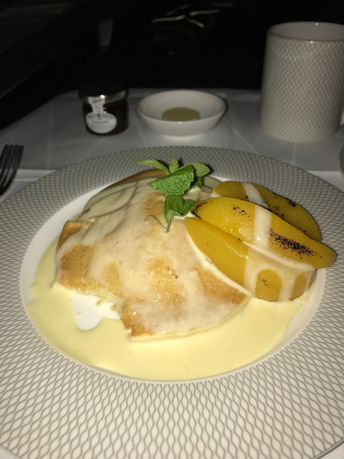 Pancakes with warm peach slices and vanilla anglaise which was also yummy.