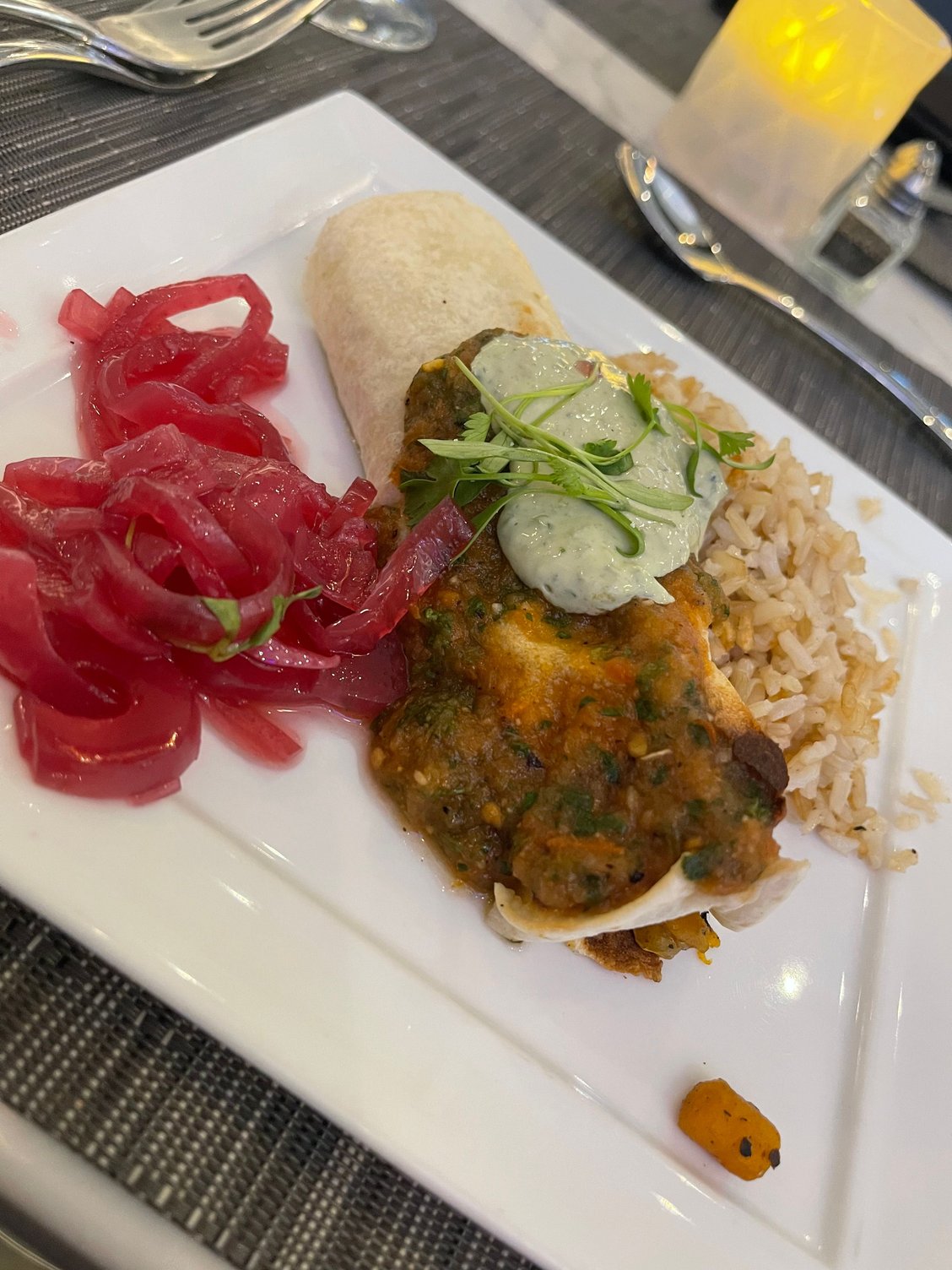 Carnitas appetizer was delicious as was veggie enchilada. Pear dessert also very tasty. Buffett not so impressive. Hard to mess up mac and cheese and rice and lentils, but both were not good. The chicken was great tho. Bar program on point. No complaints. Makes up for the subpar on-board product.