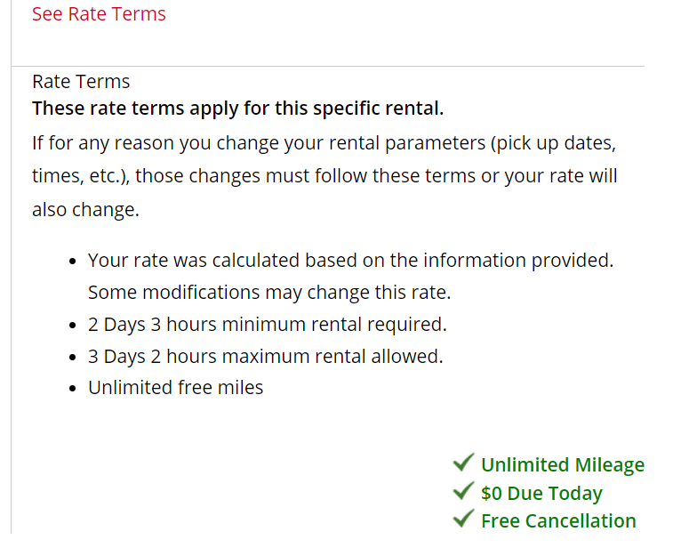 However, many rates also have a min/max or other triggers (Sat overnight keep, etc). If you book through Avis.com, on the 4th/final page (titled "4 YOUR INFORMATION), hit the "See Rate Terms" button and you should have something expanded like below. From there, you can see if your new times will meet the requirements. If not, the rental will be repriced at return into something nobody will be able to advise in advance).
