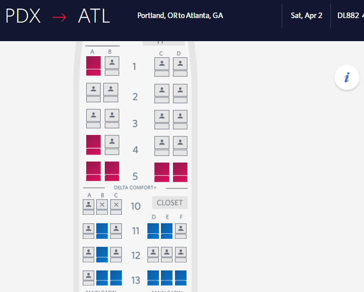 Flight 882 PDX - ATL with connection to DCA on M fare = seats 10B, 10C, 11B, 11D, 11E, 12B, 13B, 13C, 13D, 13E, 13F all blocked.
