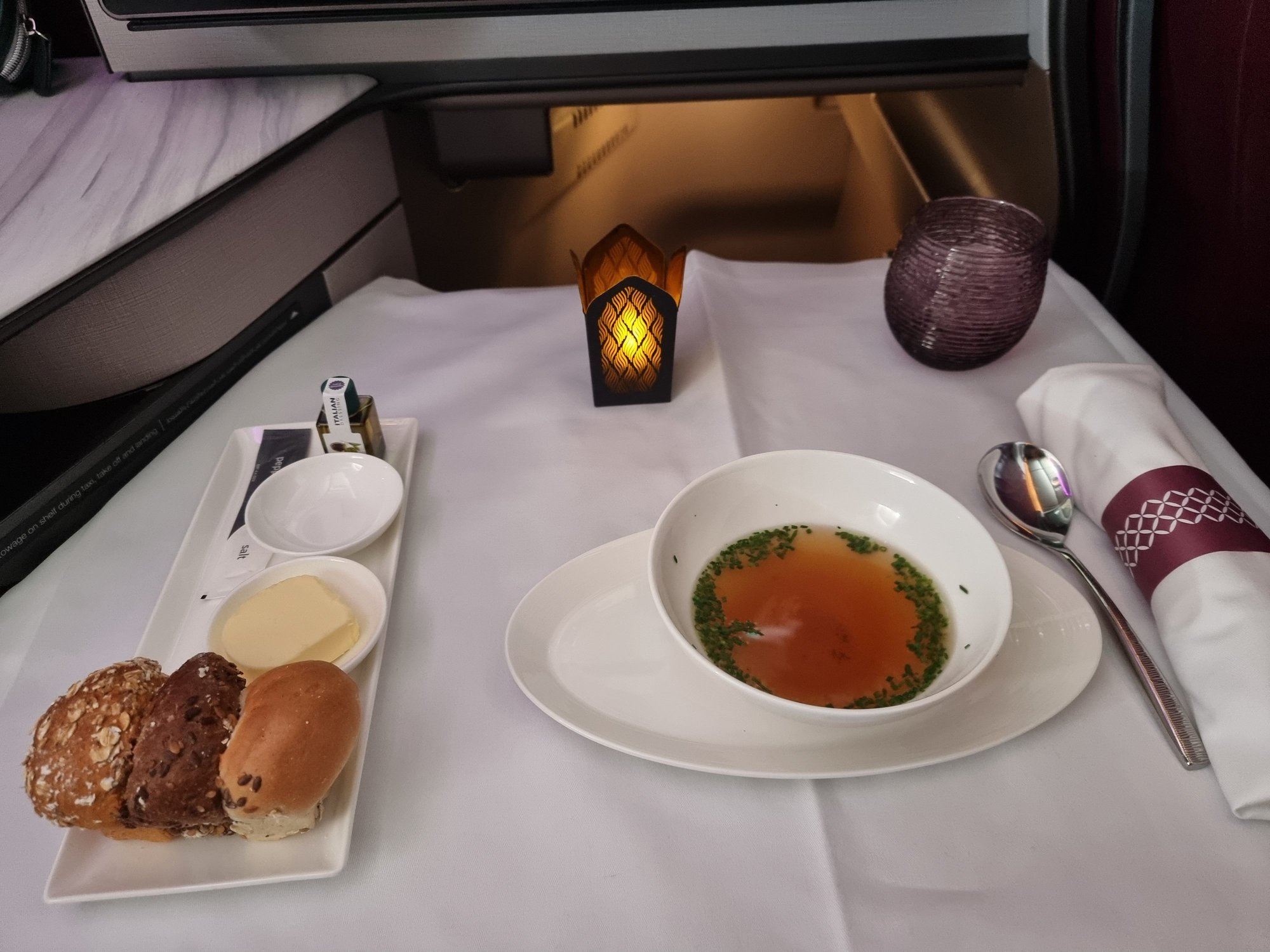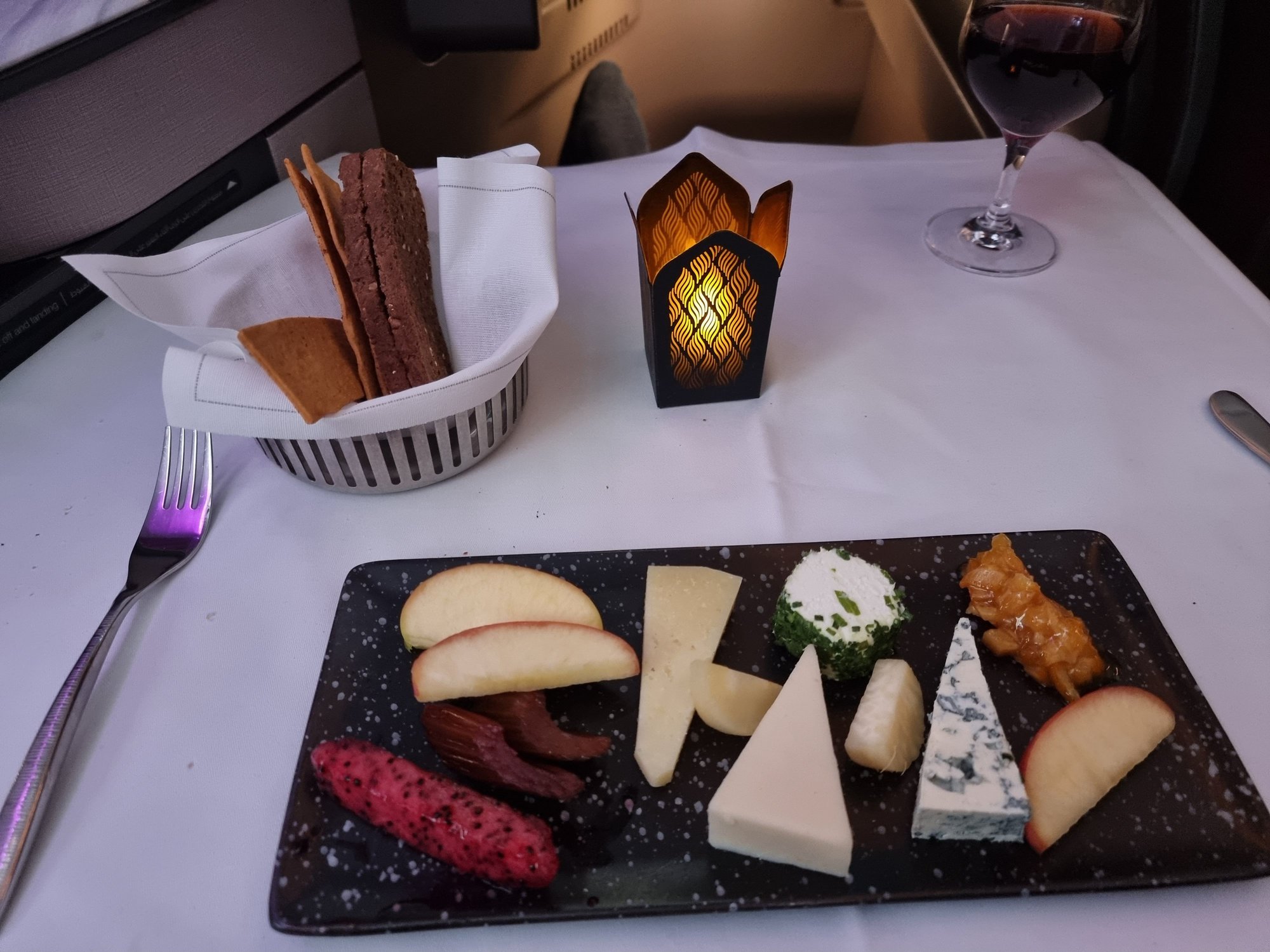 Hot towel, no choice about hot or cold. Meal seems to be return catered from Doha and obviously they got a good deal on the lamb pinwheels as seems to feature in many dishes. Wish I'd ordered the prawns!