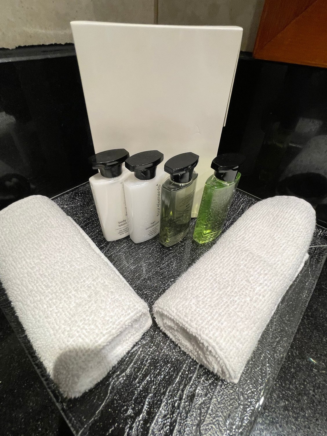 Tiny bathroom with bathtub. Pretty cheap Four Elements amenities
