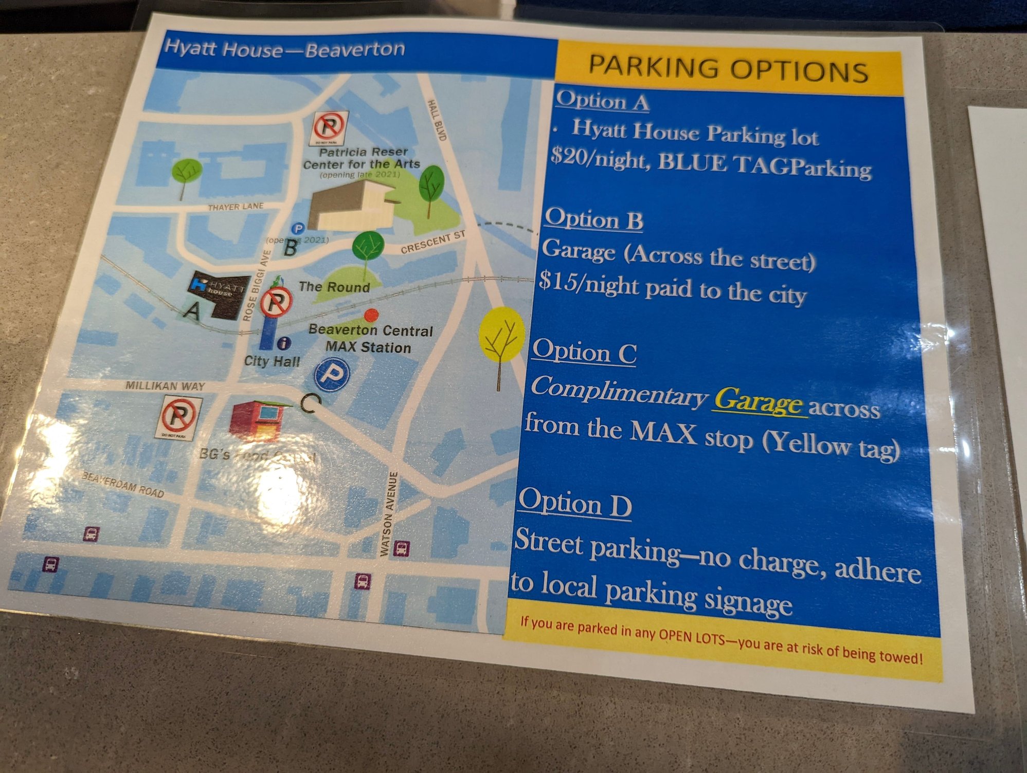 Parking is limited, but there are indeed nearby options that are actually cheaper than the hotel lot and they provide information at the front desk. When we arrived, the hotel lot was supposedly sold out (sign at entrance), but we parked in one of the open EV spots and they actually gave us a parking pass (free for award night). They have seven ChargePoint chargers. Two were dead, and most were blocked by ICE vehicles. The charging cost is quite good ($0.09 cents per kWh).