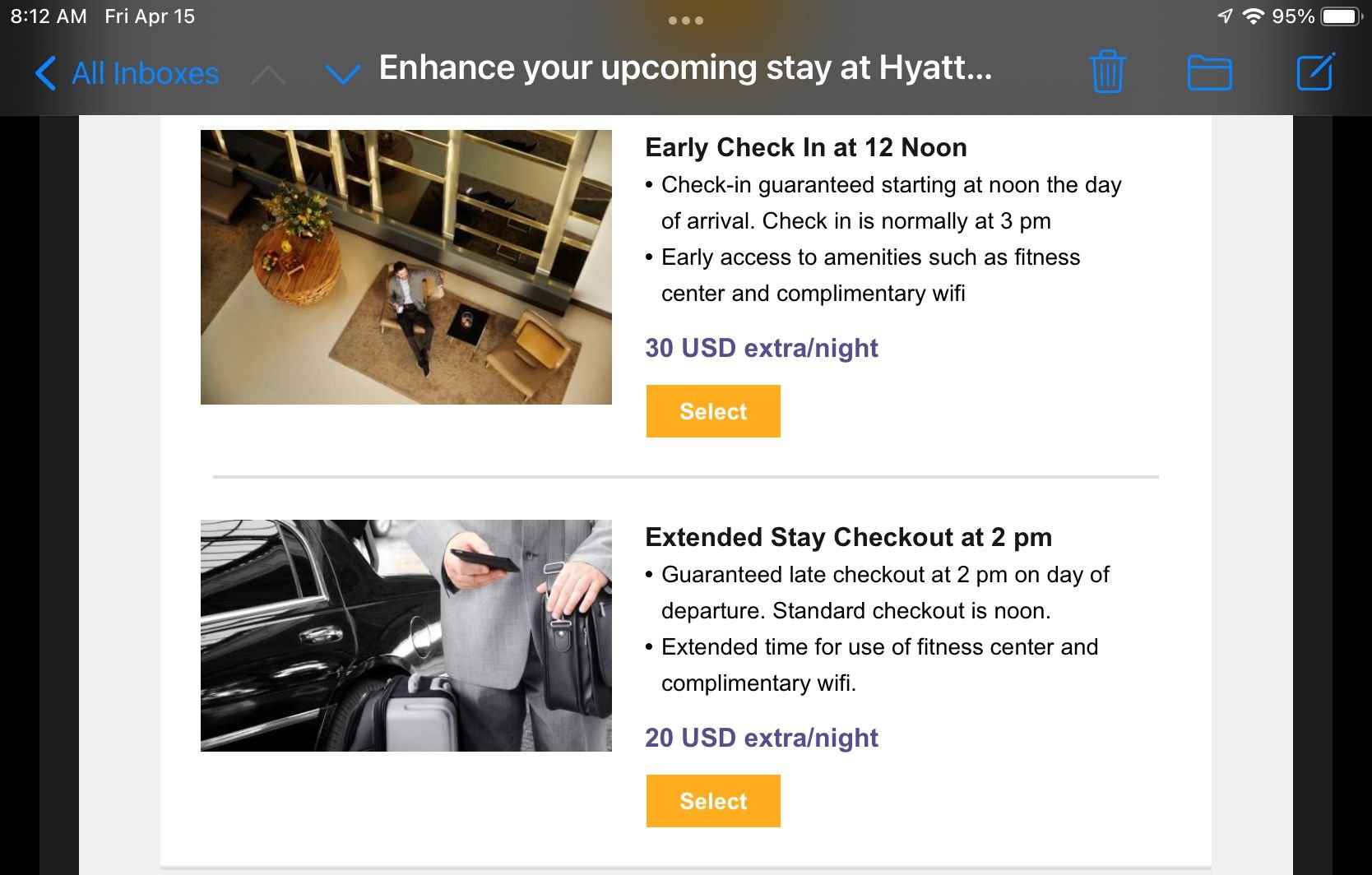 I received an email the day before a recent stay, titled “Enhance your upcoming stay at …”