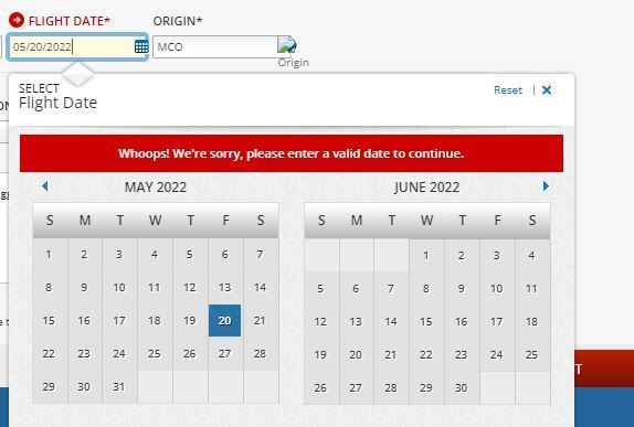 Trying to claim refund for baggage checked last week (3 bags $100) for a flight cancelled after checking in. I keep filling the form in on different PCs and different browsers and keep getting the message shown on the form - it will not recognise the date (or any other date for that matter) past or present. I've tried hitting 'reset' and nothing happens. Does anyone know how to fix this bug or is it easier to initiate a chargeback