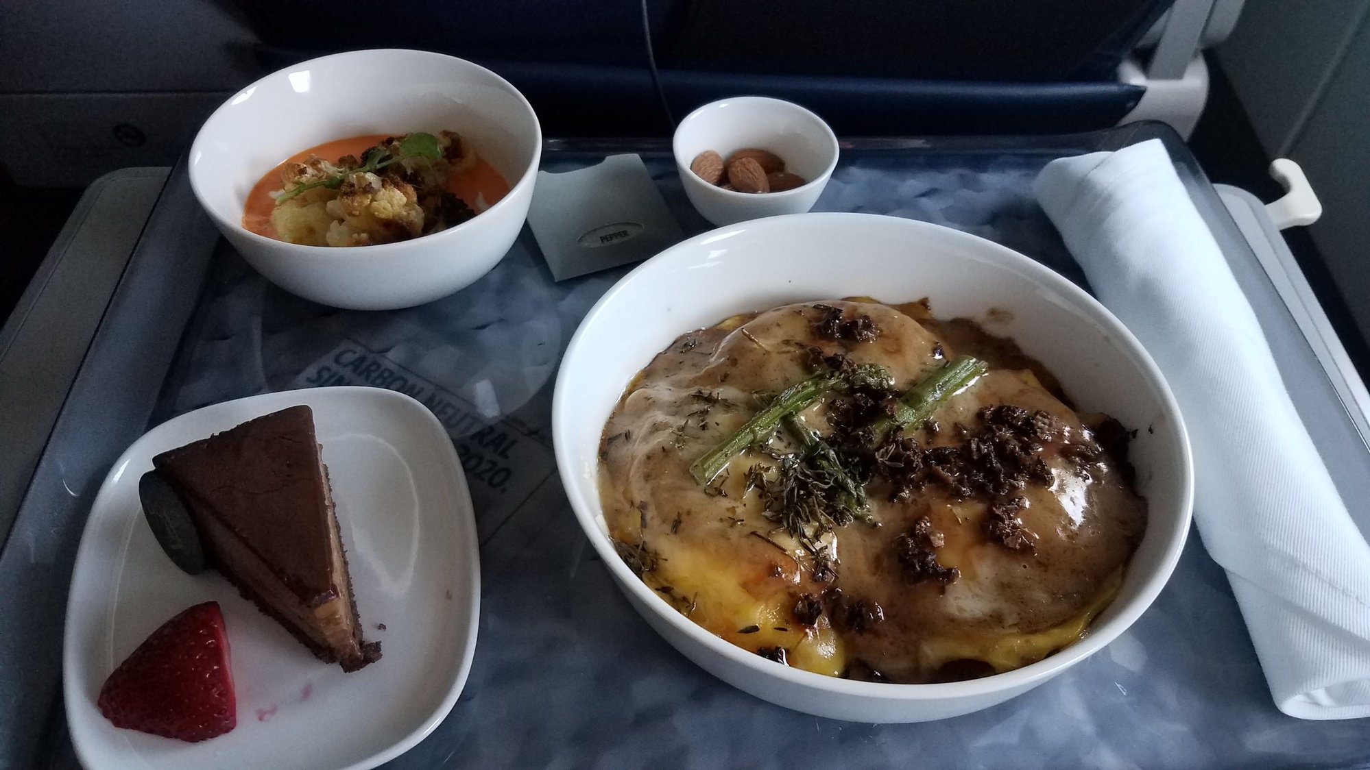 Lunch today on DL1483, DTW-PHX. Choice of this (mushroom ravioli), a salmon poke bowl, or pastrami Rueben. Not sure what the red stuff is in the bowl w/the roasted cauliflower, but it was good.