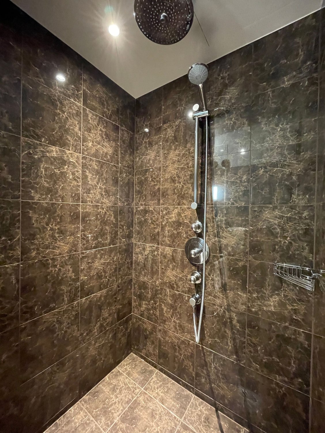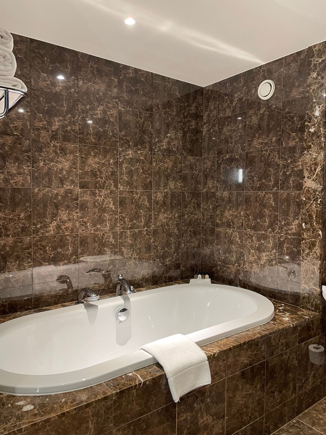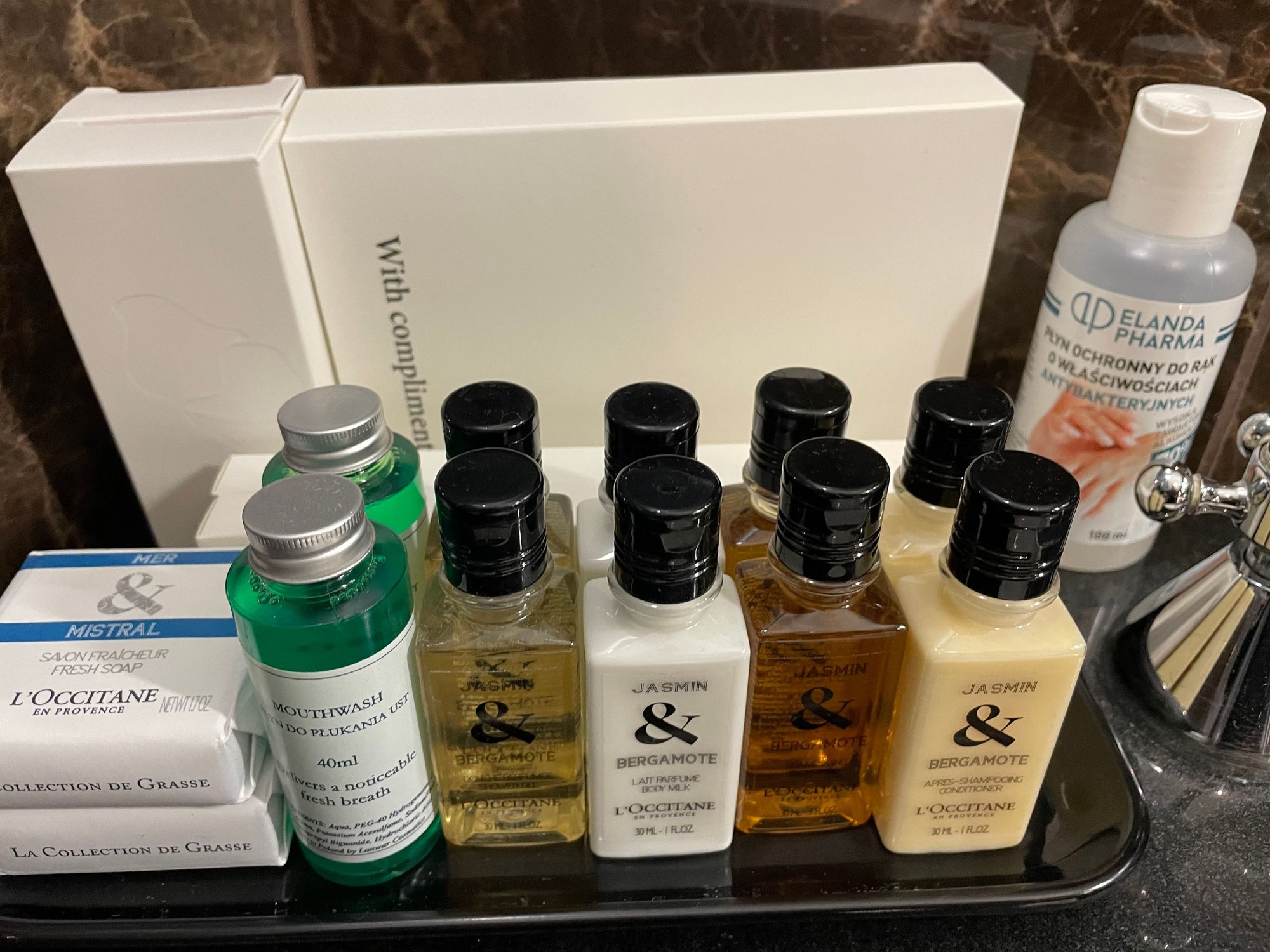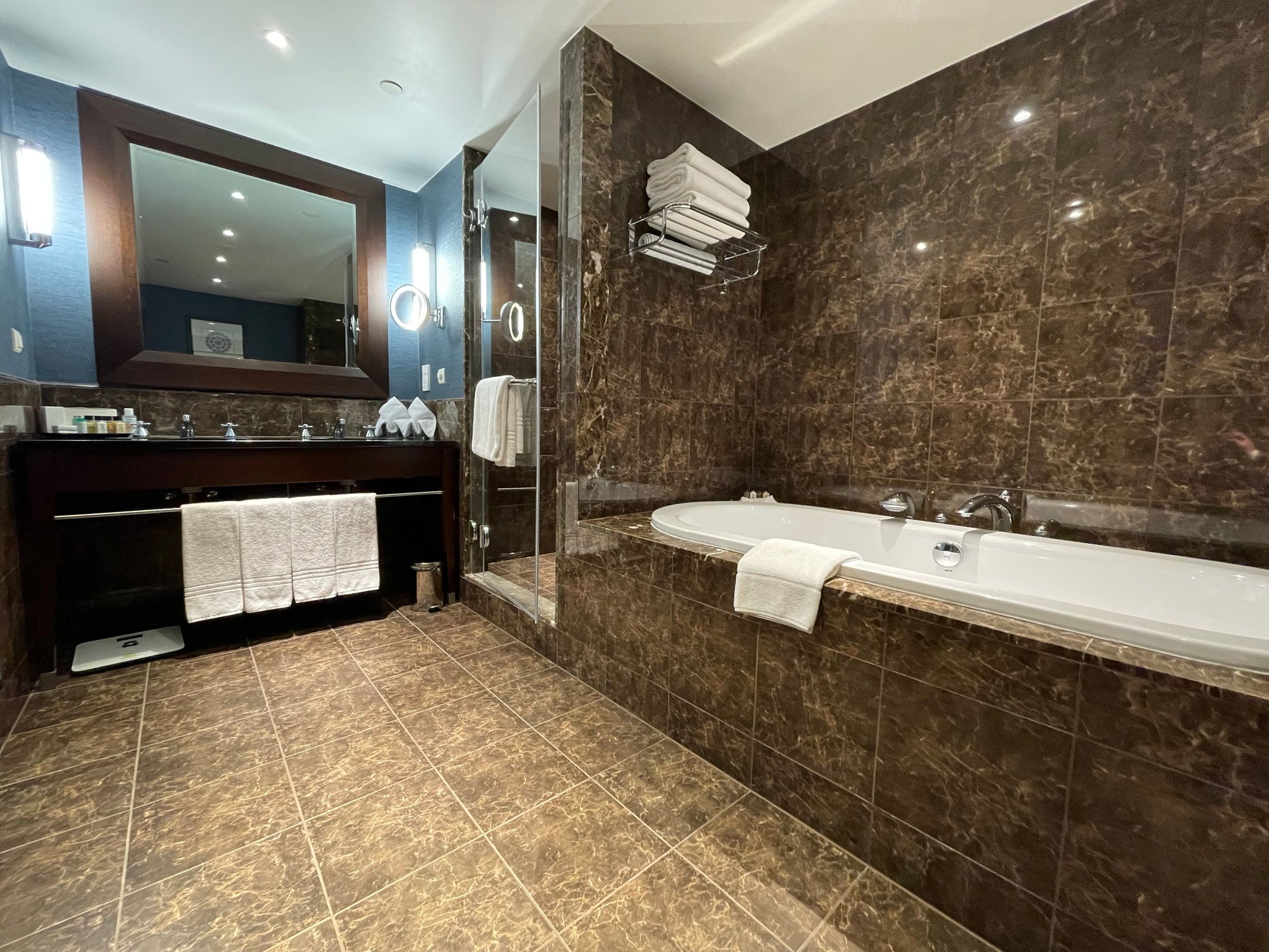 Nice marble bathroom with huge bathtub and separate shower. L’Occitane toiletries.