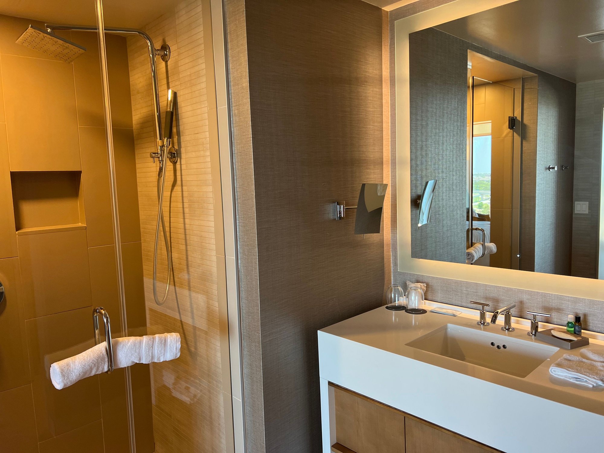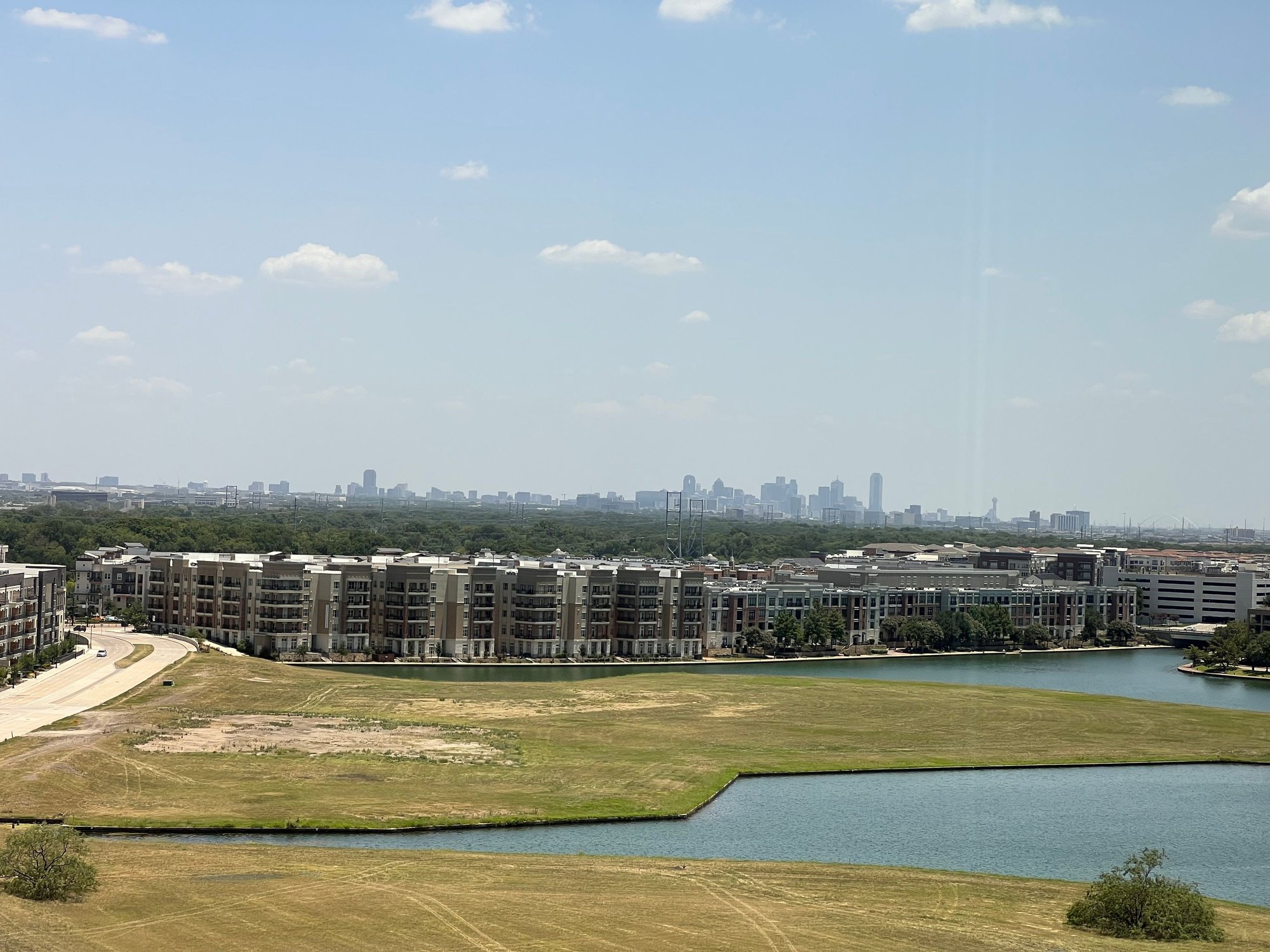 I was upgraded the night before to an Executive Suite, which stuck. My Executive Suite was on the 12th of 14 floors and faced NE. The view consisted of the Irving Convention Center, but you could also the full skyline of Downtown Dallas past Las Colinas. There are no door divisions in these suites, but the suite remains spacious. There is a half-bath in the entry. The large couch in the living room was comfortable. There is a small dining table with two chairs and two TVs with the Internet TV OS. The bedroom side a leather lounger and a usable work desk. The bed is quite comfortable - though I was sad in the lack of the Heavenly duvet. The mattress was really sublime, though, and I slept well. The main bathroom is large with a soaking tub and a separate shower with good pressure. The toilet had an incredibly powerful flush. Window coverings are motorized.