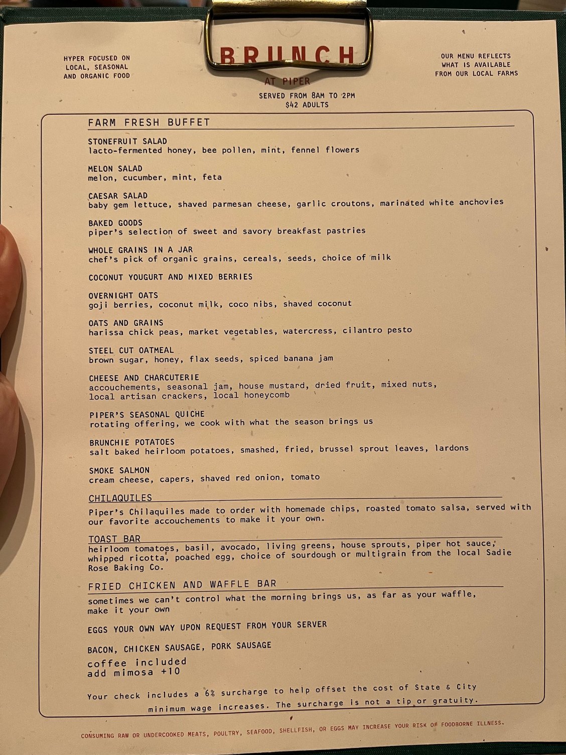 Breakfast: A la carte on Friday and buffet (with a handful of a la carte options) on Saturday. All charges were removed. We found the food to be very good. The buffet includes made to order eggs and other items are made to order at the buffet (e.g. avocado toast, chilaquiles; see picture below for full list). Friday was calm but Saturday was very busy, I recommend making a reservation as there was a wait to be seated when we left.