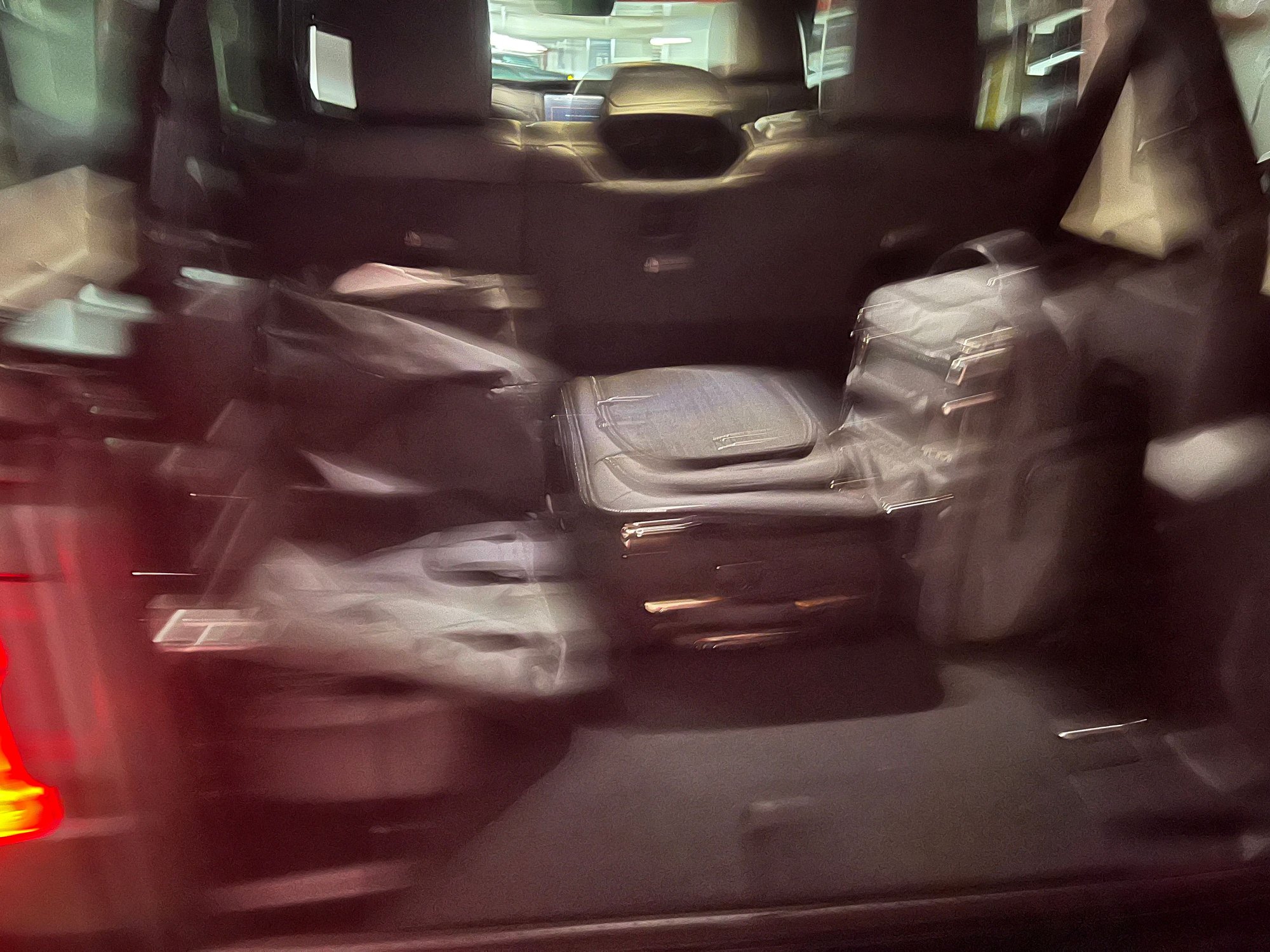 Visibility was average, though it drove way bigger than my personal JKU. I appreciated the blind spot monitors, parking sensors, and excellent lighting for tight city night-time driving and parking garage maneuvers. Rear seat passengers had plenty of room even with both front seats adjusted rearwards although it is not that big back there. Seats were OK - not great - but no one is buying a Wrangler for the seats. At least this one has adjustable lumbar, which is nice. Trunk space is small for a vehicle this size, sorry for the blurry photo but as you can sort of see a backpack and carry on rollerboard take up a good chunk of space (plus the hard top storage bag). There is no privacy screen for stowing belongings.