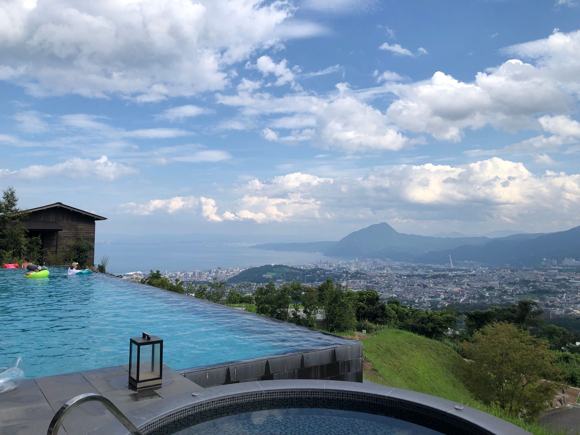 The pool is great with 12 reclining poolside chairs, but you’ve got to get there by 9:00 am when the pool opens to stand a chance of snagging a chair. The view from the pool and chairs is expansive and outstanding and makes it more worthwhile. Next to the pool is a warm jacuzzi bath. Since August is summer vacation for school children, many kids were accompanying their parents and the pool was full of kids but not overly crowded. In Japan, kids rule, so they have the run of the pool and any adult who wants to swim laps will likely not be able to unless they wait until before the pool closes at 8:00 pm when everything quiets down. Overall, it’s a very pleasant space and I would guess that this is the only (or one of the very few) onsen in Beppu with a swimming pool.