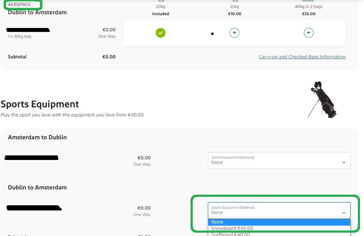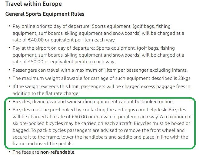 For a forthcoming Aerspace booking, a fee of €40 per item is required in order to bring Sports Equipment. Note that a bicycle costs €50 per flight, and has to be booked separately; they limit the number per flight and you can't prebook/prepay online as with other Sports Equipment.
