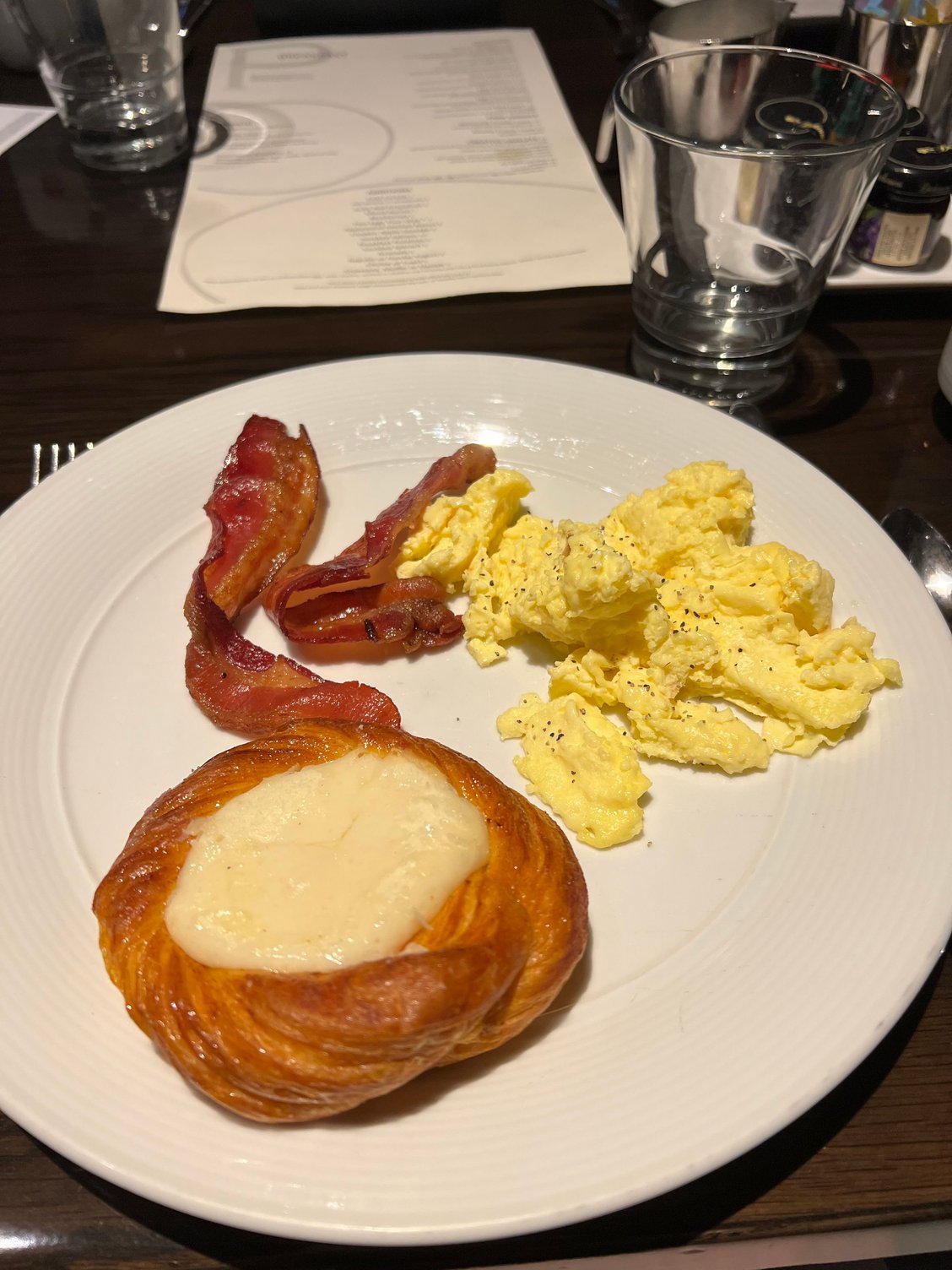 Yes, this is mostly a con, but I'll share my experience with the advice that you shouldn't normally take the breakfast choice for the welcome gift - I just got lucky. When I arrived around 7:15 AM, I walked into a Park Grill full of about 70-80 people very awake and speaking a lot of French. Nevertheless, the host found me a table and told me to eat at the buffet (just three rollable tables) and to take advantage of the hot food as they don't usually have that. Sure enough, there were dishes with eggs, bacon, potatoes, and a tray of pastries. Everything was decent - slightly better than lounge fare. However, about 10 minutes later, the staff came out and rolled the hot food table away - leaving two tables with just cereal, oatmeal, and fruit. Luckily, I had already gotten two helpings of the hot food, so I was all good, but the selection that was left and that would normally be there if there wasn't some sort of group was paltry and wouldn't even constitute a breakfast IMO. If they had pastries out, I could justify it, but nope, not just cereal and fruit. I will say that my server was quite nice and even brought me out a "special smoothie" in a shot glass - it was tasty (just strawberry banana). So, in conclusion, I had an enjoyable breakfast, but I know that most Elite members would not. The paltry "continental" offering really leaves a stain on what is a rather great hotel offering.