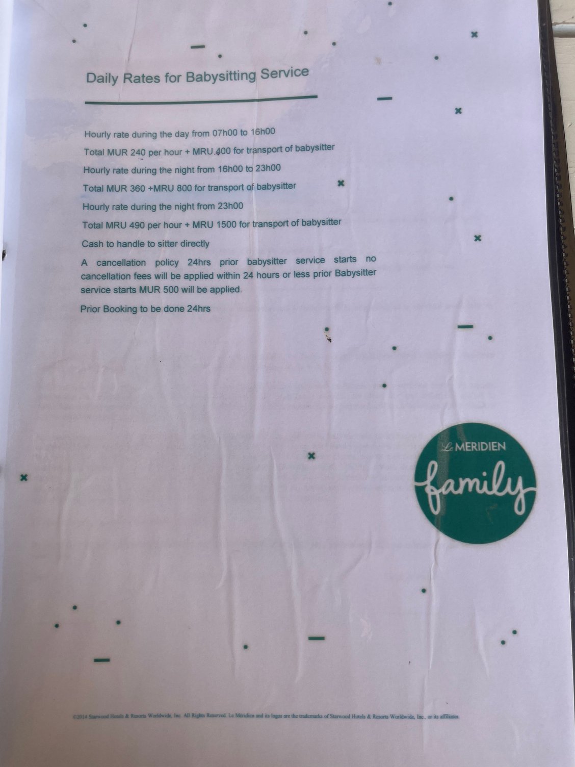 - kids under 4 require a dedicated babysitter which has to be booked one day in advanced. Rates are reasonable for the day and go up later (highest at night). See image below
