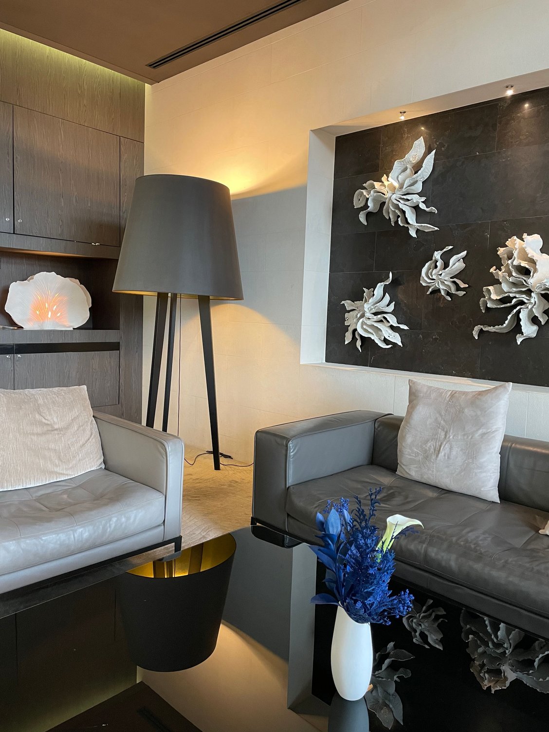 Lovely fresh flowers in both living room and bathroom.