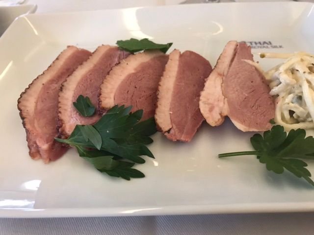 - Appetiser was smoked duck breast with a small side. Was OK, but lacked any flavour