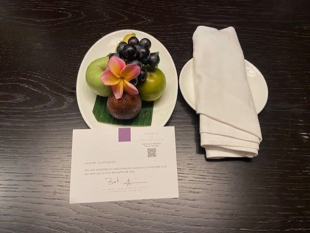 Just completed a 10 night stay here. Was upgraded to a Conrad Suite, no email but was visible on the app a few days prior to check-in. Welcome fruit amenity left waiting in the room for my arrival along with a bear. Rin for breakfast is super convenient for the Suites block and much more quiet although Suku does have a more extensive range of options. Afternoon Tea & evening cocktails both had very attentive service levels. The menus with current pricing for the restaurants are available here (the main hotel website links don’t work for me)
