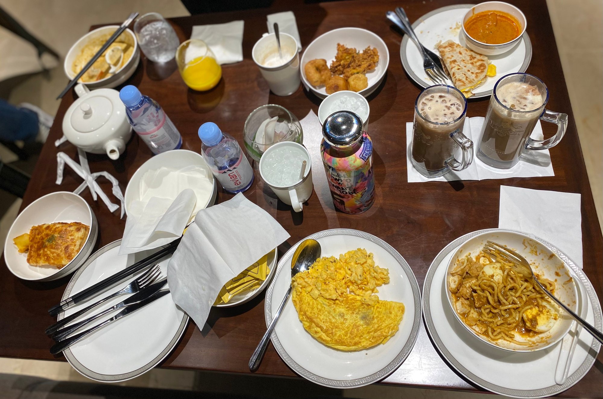 Selection we had including mee rebus , prata with fish curry .. ham , mushroom , onion omelette - think some cheese too . Iced latte , mocha ..