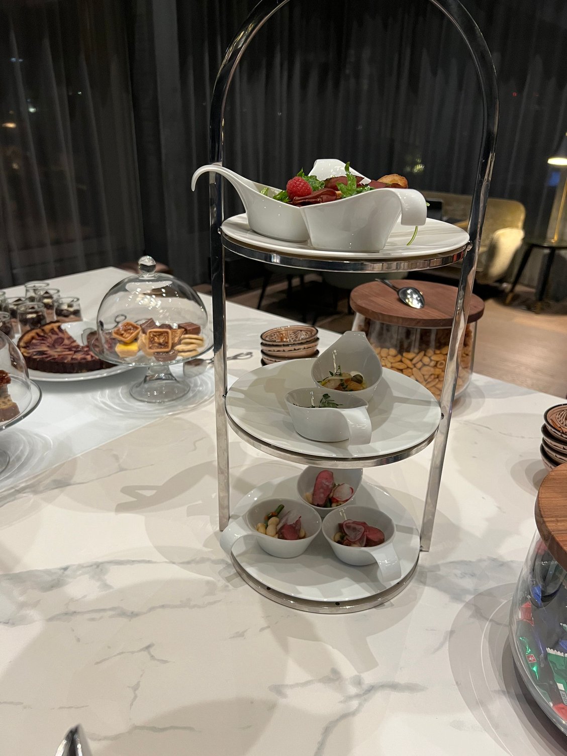 So I am currently here and the hotel is fabulous. The Regency Club lounge is open again but the offerings are quite disappointing. There is humous and yoghurt dip with small pitta breads which taste shop bought. There are 3 different nibbles things in small plates (beef on a cracker, smoked fish and and small beef thing) but they are tiny! There is also some smoked salmon and one type of cheese but nothing to put it on - nothing! I guess I sort of expected something a bit more than this offering - but more it is all a little odd - salmon by itself, cheese with nothing to put it on, poor pittas (considering there is a Lebanese restaurant on site). None of the offerings make we want to go to the restaurant! There is one white, a Prosecco, a couple of reds and some beer out for drinks.