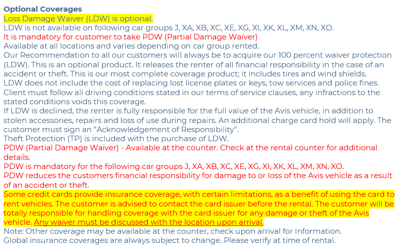 They do acknowledge that some credit cards offer car rental insurance, but they basically seem to indicate that it is going to be YMMV...and I need to negotiate this with the Avis employees upon arrival (which is far from ideal).