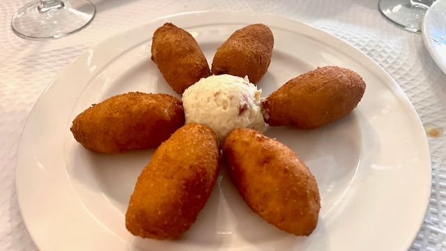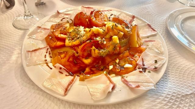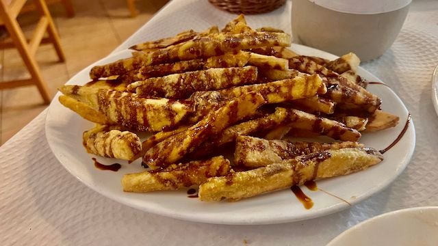 Having walked several kilometers, we were tired and in need of food. I suggested that we drive a bit and to get away from the touristy restaurants. This really paid off. We ended up at a great Spanish restaurant where we were the only tourists. We had a beautiful tomato salad, croquetas, and eggplant with local honey.