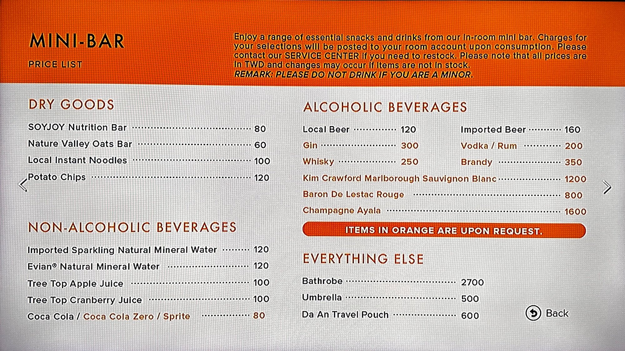 You can enjoy up to 600TWD food and beverages from Bar or Mini-Bar by RAID THE BAR voucher. Currently most of alcoholic beverages are request base. Only beer, some of soft drinks and snacks in the room.