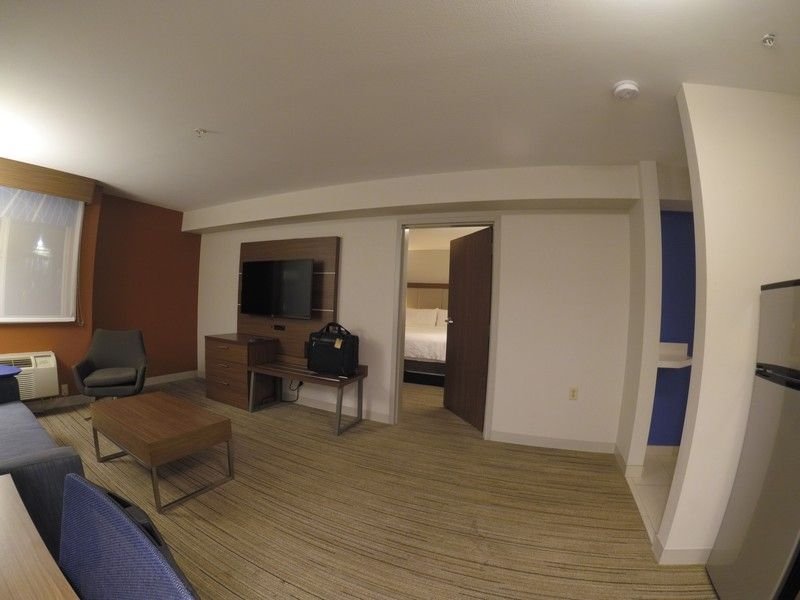 The living room had a sofa which could be used as bed, a table an armchair, desk, a large fridge, sink microwave and the usual Keuling capsule machine. The desk also had a lamp an international socket, which so far I never experienced in a budget hotel in the US . A large flat TV was facing the sofa. Below the TV was an sideboard with drawers and a place to store the luggage.